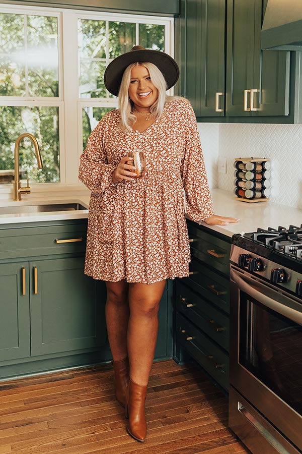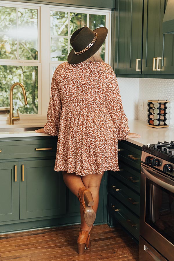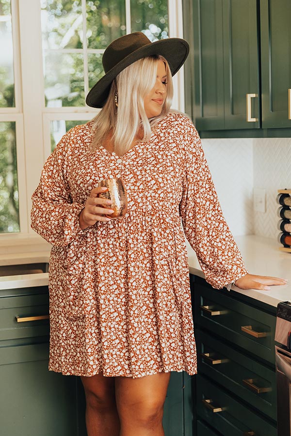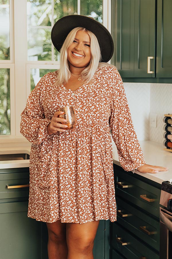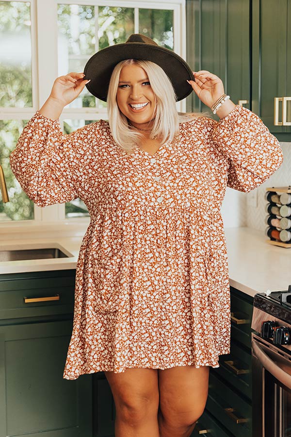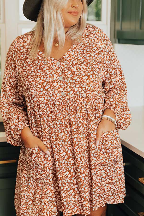 We have no doubt you won't be able to stop smiling when you wear this pretty plus size rust colored shift dress featuring lightweight flowy material patterned with a small white floral print, a button up bodice with a v-cut neckline, long bubble sleeves, hidden front pockets, and a relaxed silhouette that falls into a straight mid-thigh length hemline! Measurements