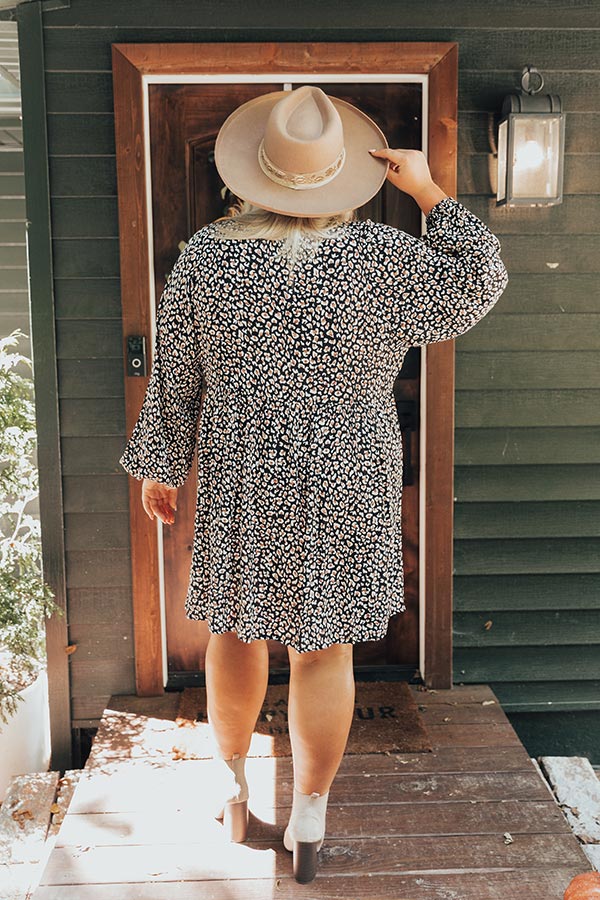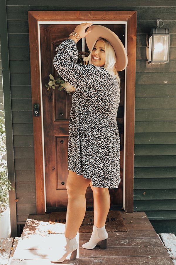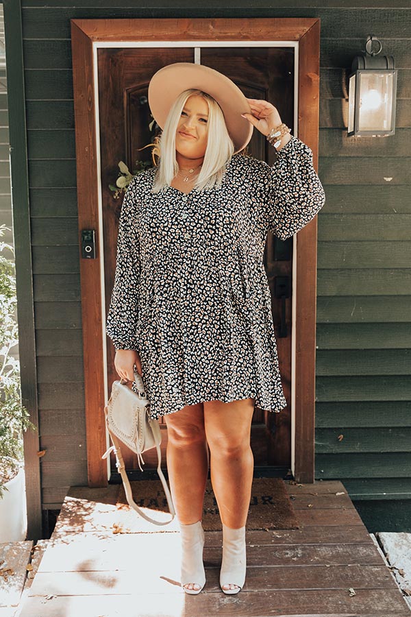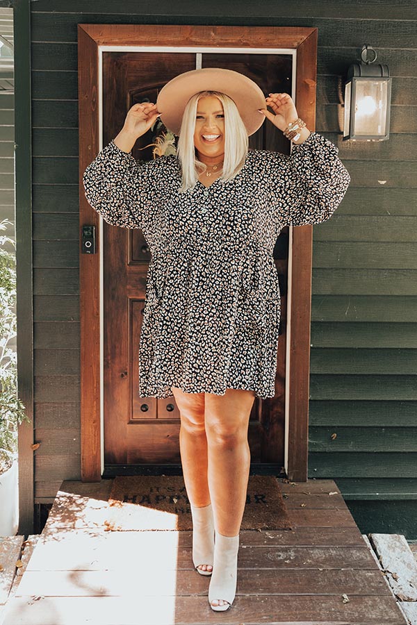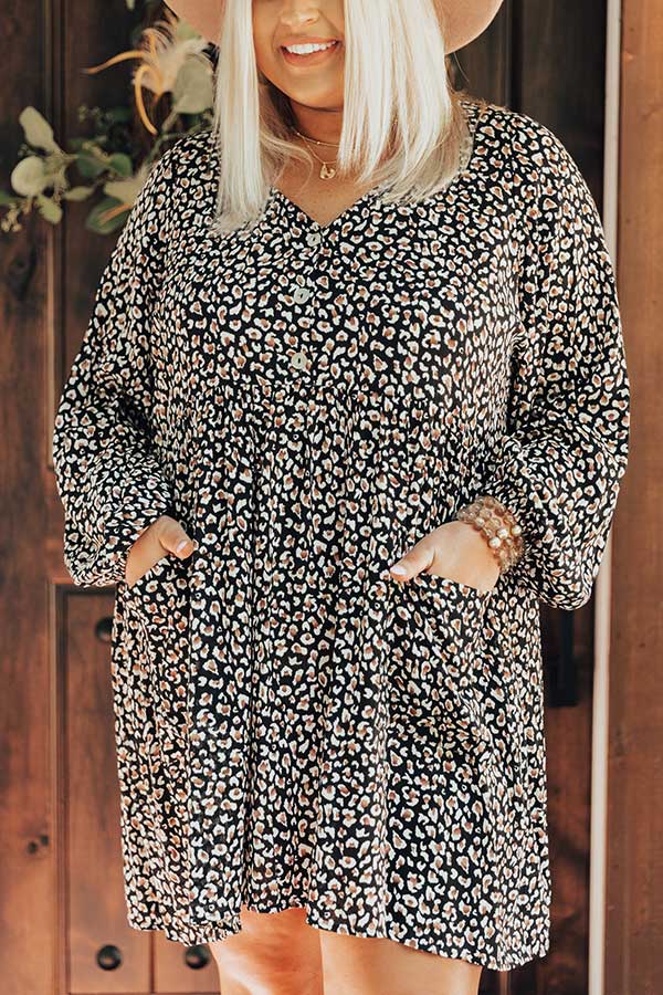 We have no doubt you won't be able to stop smiling when you wear this pretty plus size black shift dress featuring lightweight flowy material patterned with a small brown and white leopard print, a button up bodice with a v-cut neckline, long bubble sleeves, hidden front pockets, and a relaxed silhouette that falls into a straight mid-thigh length hemline! Measurements