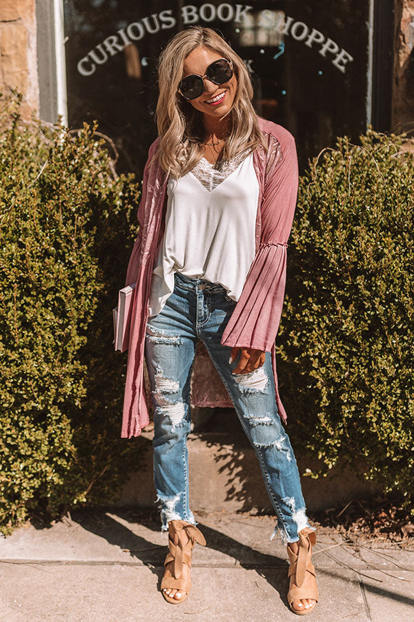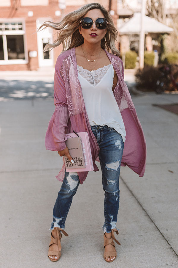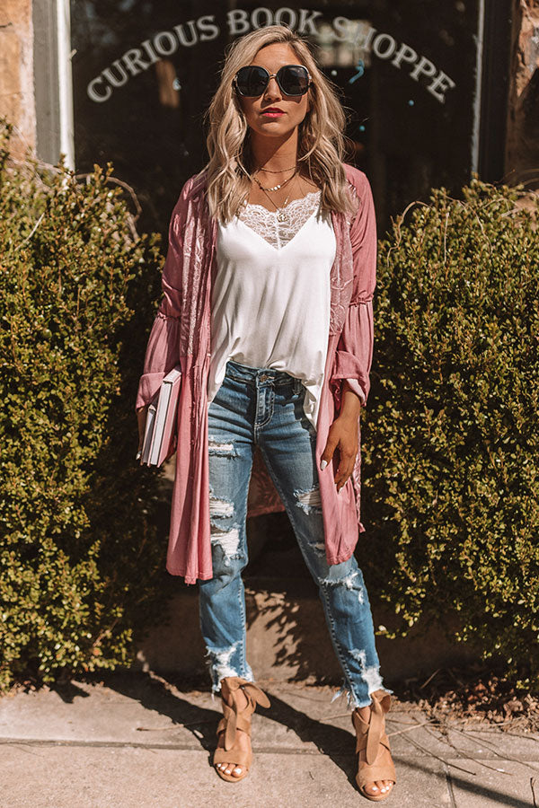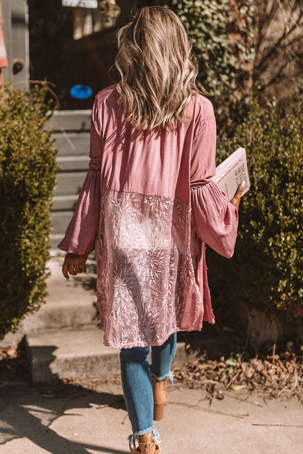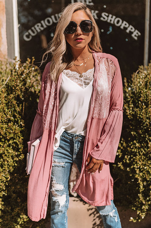 You no longer have to "keep wishing" for the perfect overlay because this blush cutie is the only one your summer wardrobe will ever need! With its lace accents, knee length fit, slit hem, and loose flared sleeves that start at the elbow, it styles beautifully over a basic white tank and distressed skinny jeans or over you favorite pair of summer shorts and swimsuit! Measurements