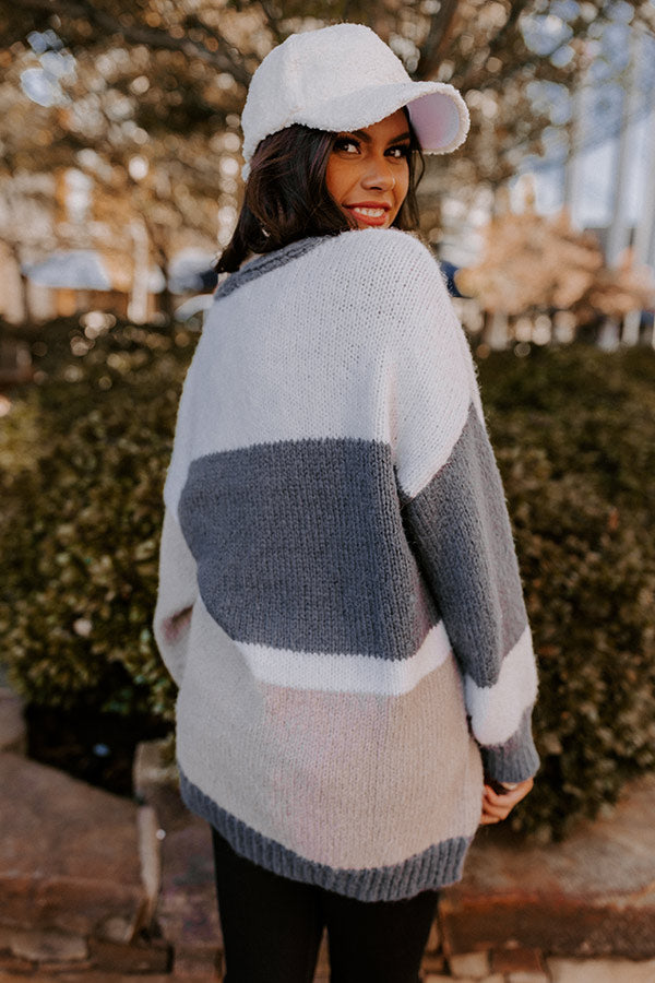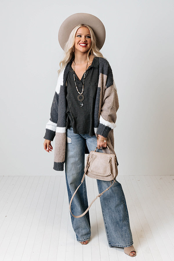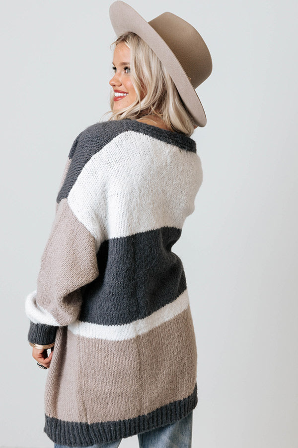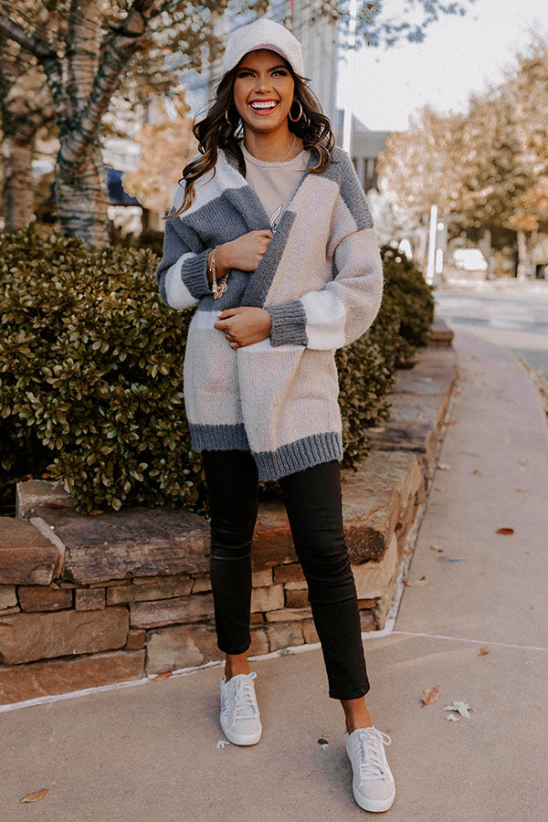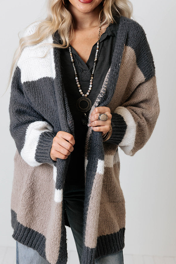 Layer up for winter in our adorable 'Keeping Knit Real Cardigan' featuring soft and warm knit material patterned with taupe, white, and charcoal hued color block panels, long loose sleeves, ribbed trim detailing, and a draped open front silhouette that falls into a straight mid-thigh length hemline!