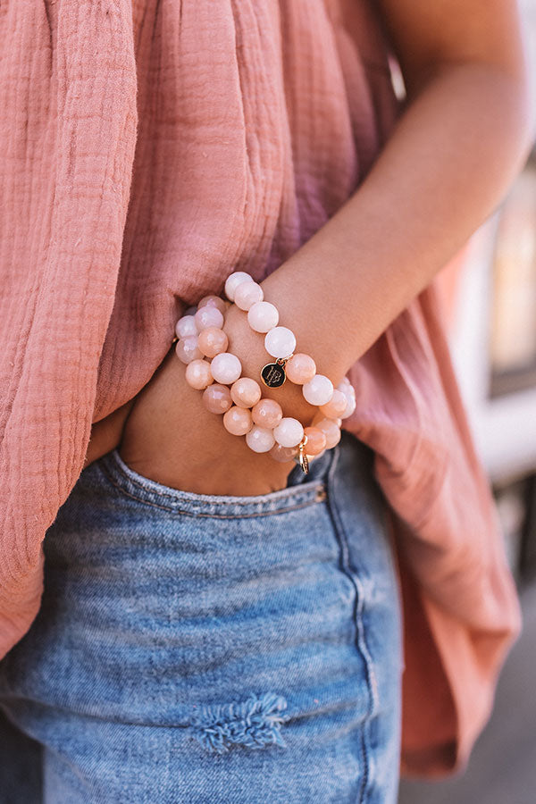 The "Kendley 50" bracelet features a 7.25" stretch band finished with peach colored beads and a gold tag!