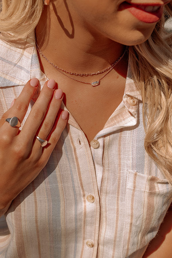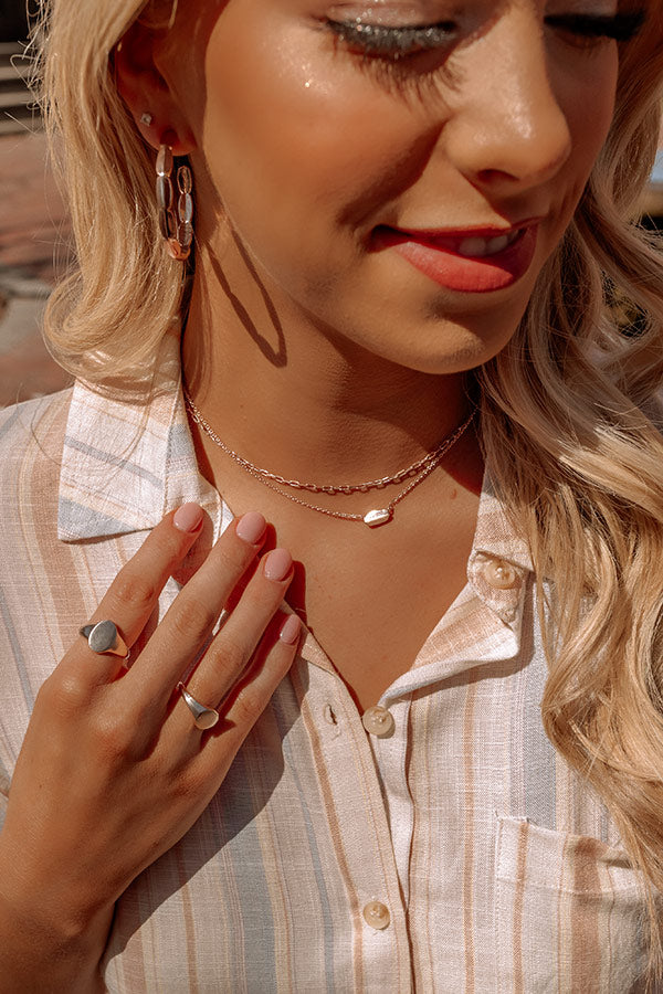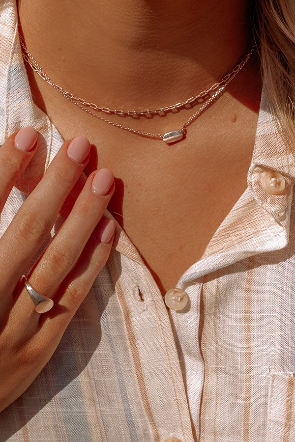 Layering has never looked as polished as it does with the Brooke Multi Strand Necklace in Rose Gold. Pre-layered to throw-on-and-go, a classic link chain complements a folded version of our minimalist Fern icon. Metal: 14k Rose Gold Plated Over Brass Size: 0.21"L x 0.49"W, 16.76" & 16" chains with 2" extender Closure: Lobster clasp