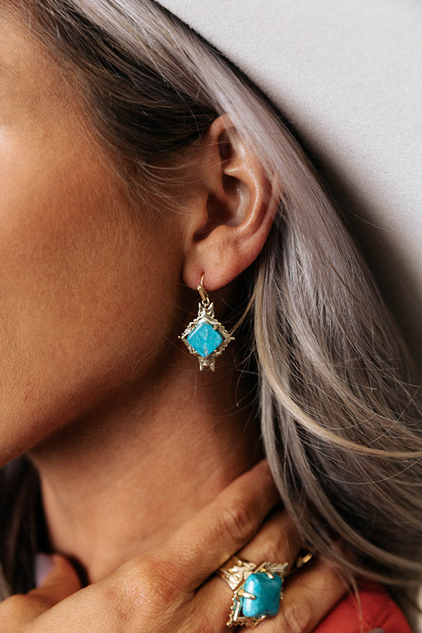 Introduced nearly a decade ago, an original icon, inspired by kilim motifs and traditional Southwestern design. The Cass Gold Drop Earrings in Teal Howlite bring a touch of heritage detail to one of our most beloved looks.