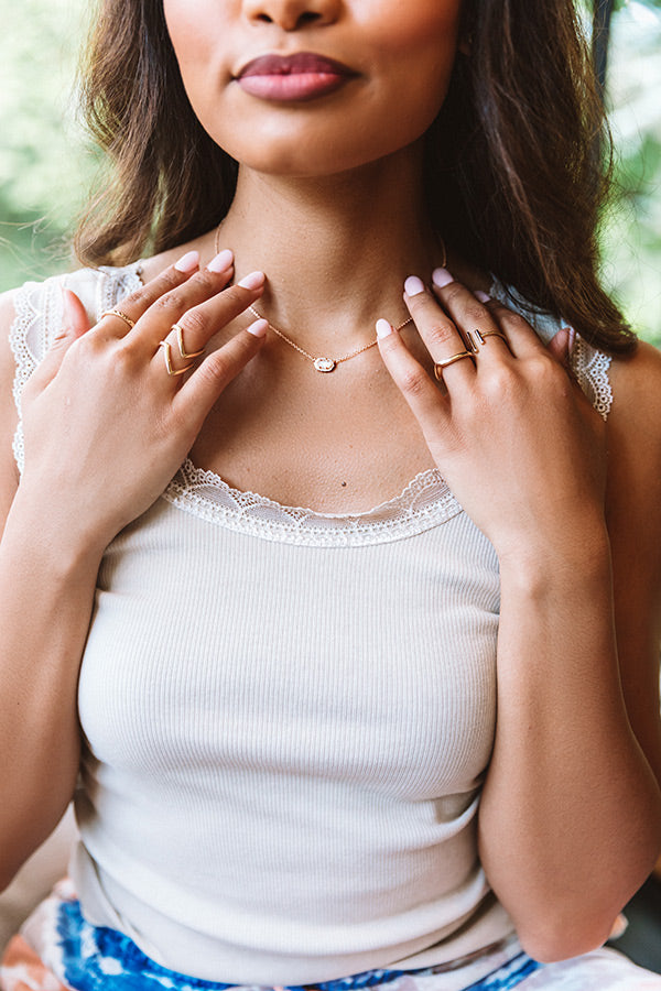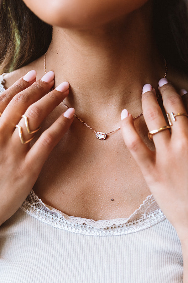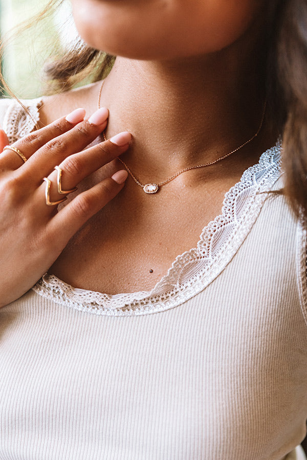 Inspired by our favorite oval silhouette and dressed up in a halo of delicate pave, the "Chelsea Rose Gold Pendant Necklace in Ivory Mother-of-Pearl" provides a small yet striking hint of sparkle! If a pendant necklace with the daintiest of details and most stunning shine is what your wardrobe needs, then look no further! Whether you pair the "Chelsea Rose Gold Pendant Necklace" with a casual or formal look, you'll be sure to turn heads! Metal: 14k Rose Gold Plated Over Brass Size: 0.47"L x 0.28"W stationary pendant, 15" chain with 2" extender Material: ivory mother-of-pearl Lobster claw closure