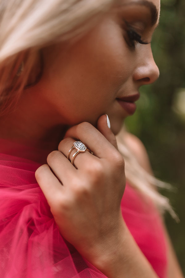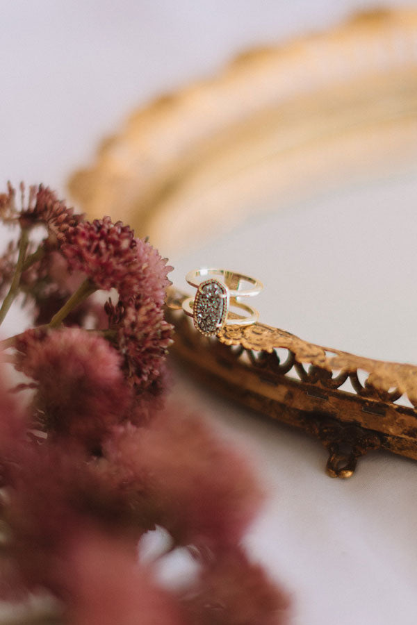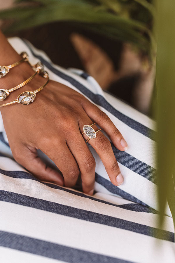 The "Elyse Ring in Platinum Drusy" is the definition of a wear-anywhere statement! Loved for its unique details, this ring features our signature oval shape and an open design! Add the finishing touch to any look with the "Elyse Ring!"