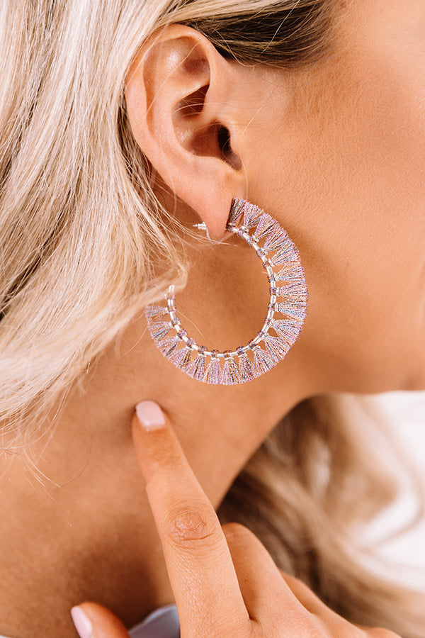 What's more fun than fringe? Meet the highlight of your wardrobe - the 'Evie Bright Silver Hoop Earrings in Purple!' Featuring colors of the moment and a touch of boho flair, the 'Evie Hoop Earrings' add a crafty element to a classic silhouette for a playful piece you'll adore!