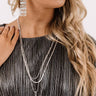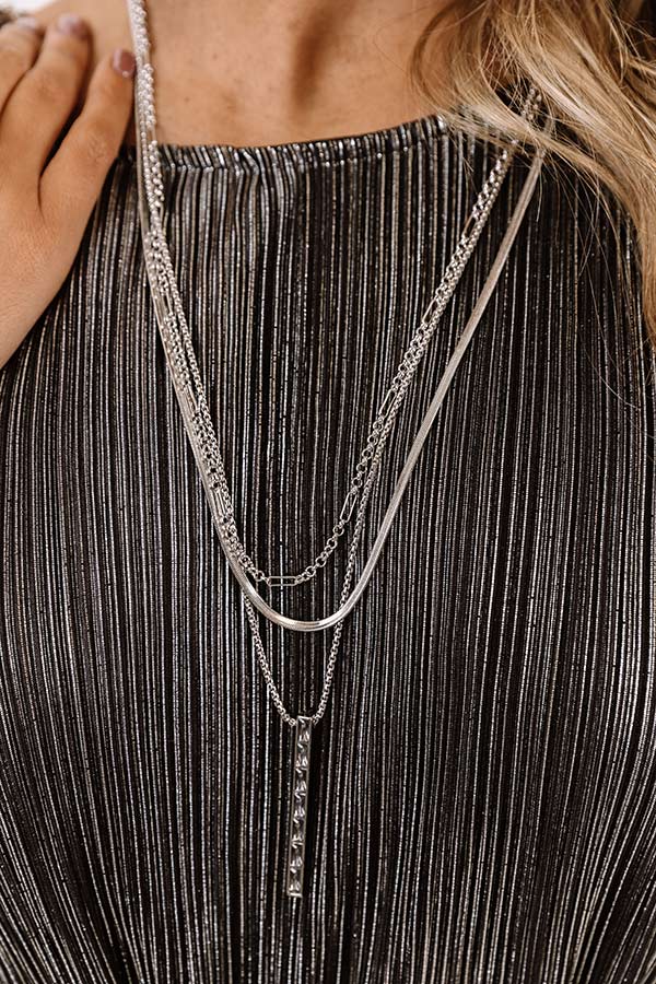 Pre-layered for you, the 'Jack Silver Multi Strand Necklace in Charcoal Gray Crystal' features a trio of curated chains and a striking long pendant made up of Art Deco era-inspired baguette crystals with high shine!