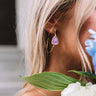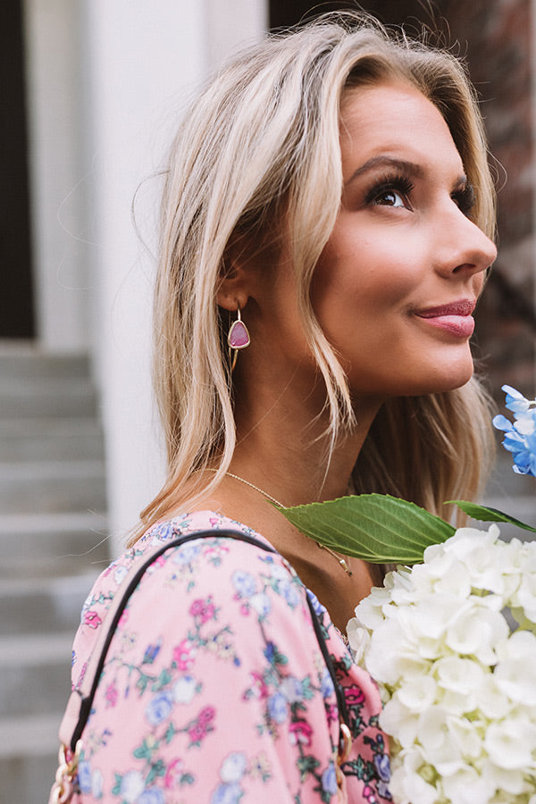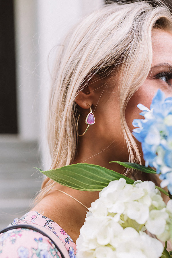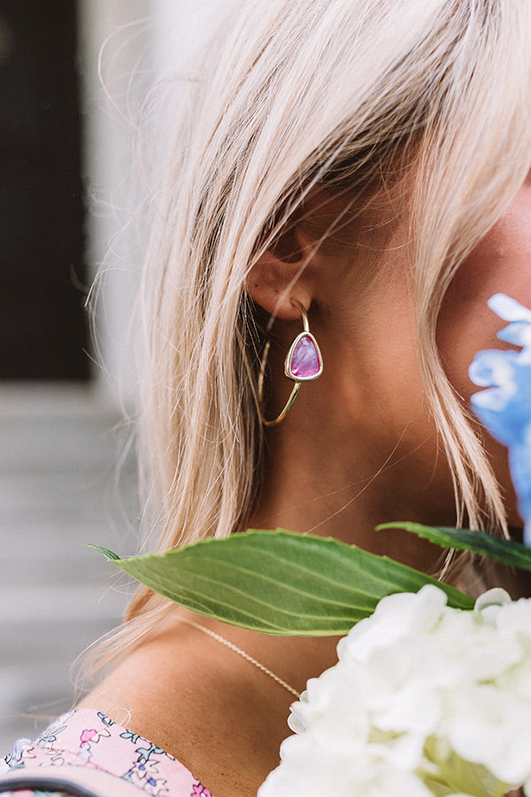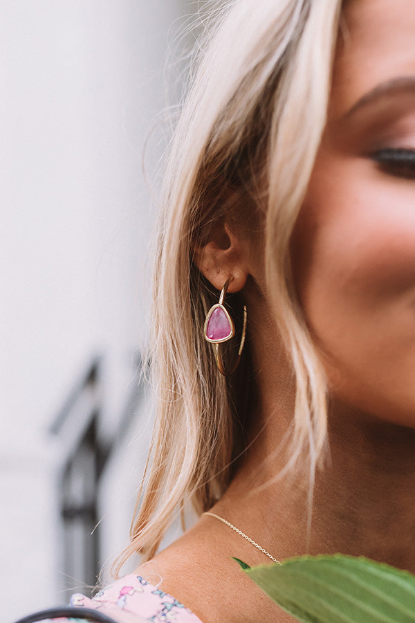 A lightweight pop of color, the "Margot Gold Hoop Earrings in Deep Blush Mother-Of-Pearl" feature a custom accent inspired by a pebble found on the beach!