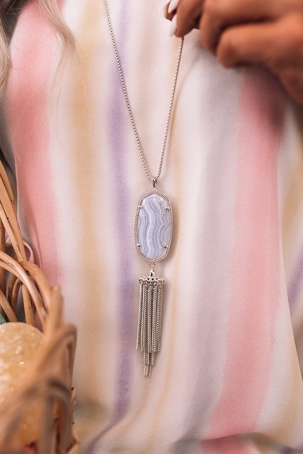 You know her, you love her: She's the 'Rayne Silver Long Pendant Necklace in Blue Lace Agate!' With our signature oval shape and playful tassel, this necklace brings you the perfect compromise of fringy and fun while still being timeless!