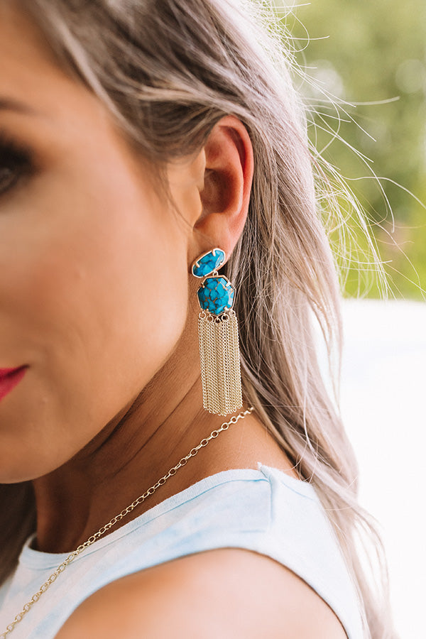 Fringed and just so fun, the "Tae Gold Statement Earrings in Bronze Veined Turquoise Magnesite" take every look to the next level with their bold stones and waterfalls of chain!