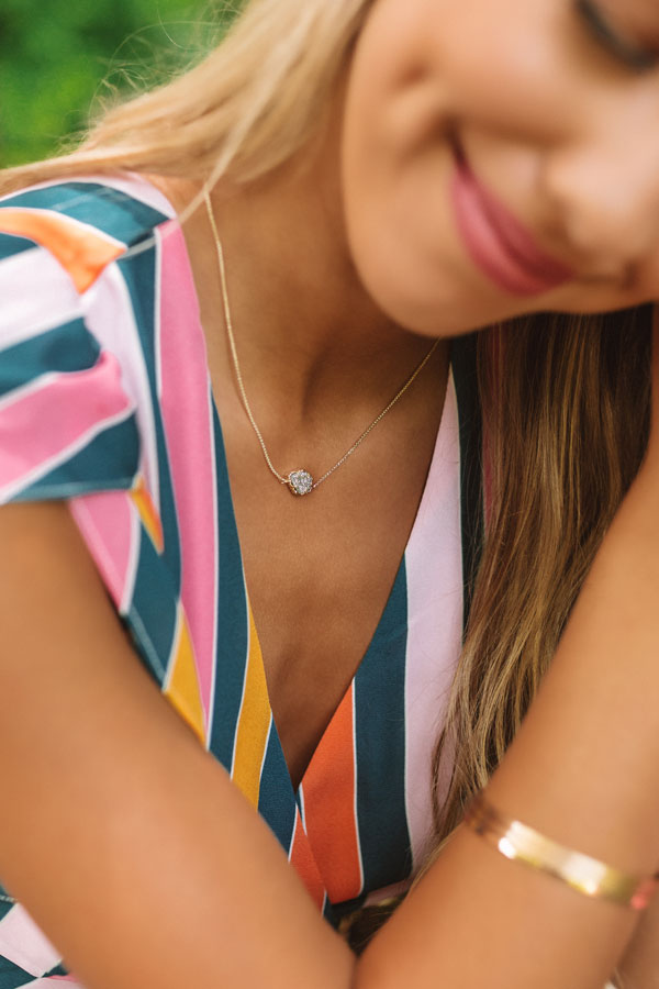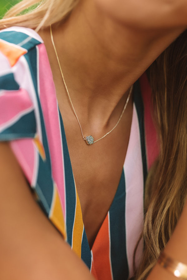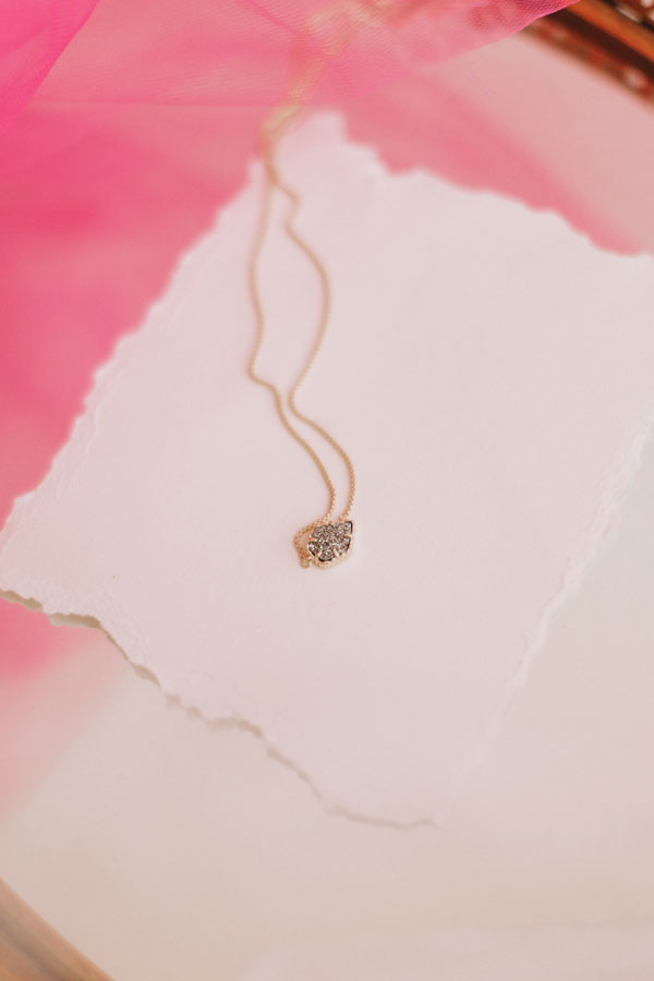 Find a classic with a twist with the Tess Gold Pendant Necklace in Platinum Drusy! This pendant necklace's pentagon-shaped stone adds geometric flair to an otherwise simple accessory! Find your latest wardrobe essential in the Tess Gold Pendant Necklace!