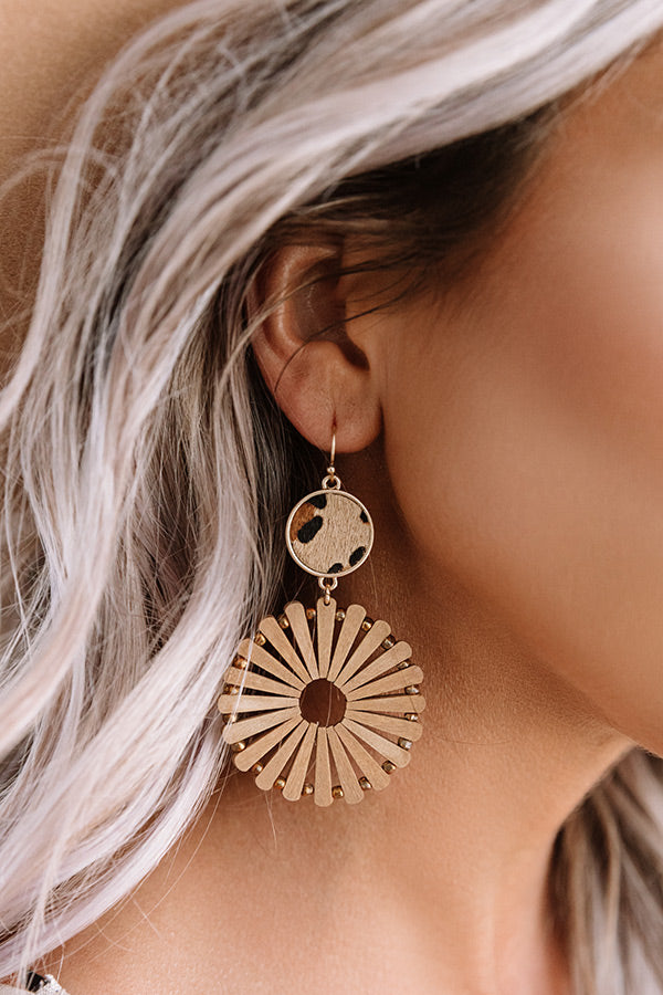 These adorable statement earrings are the "key to chic" with their dangling leopard circle pendant with larger wooden spoke hoops!