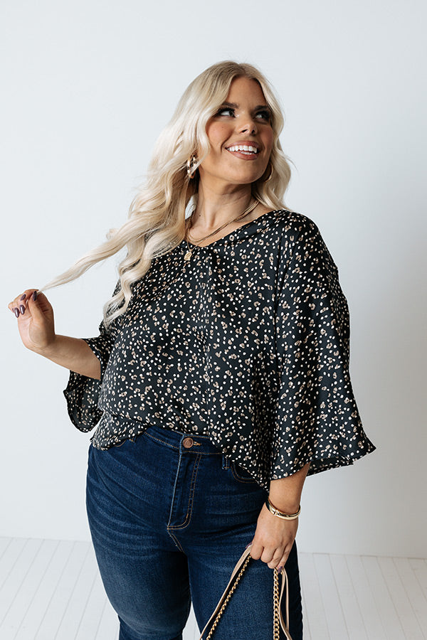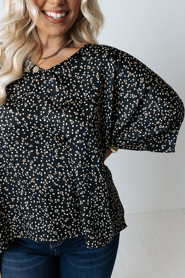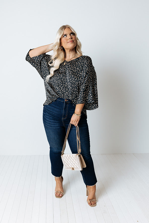 People are sure to talk about how cute you look in this adorable plus size black shift top featuring lightweight material patterned with white and brown polka dots, a v-cut neckline, loose 3/4-length sleeves, and a relaxed silhouette that falls into a straight hemline!