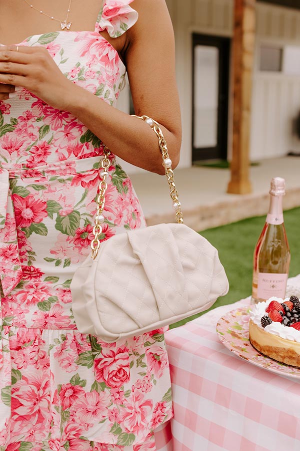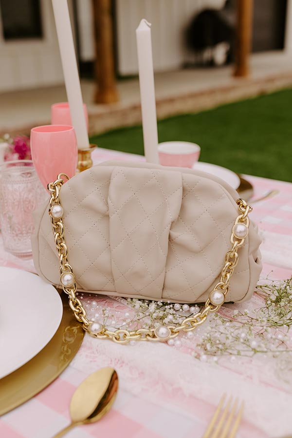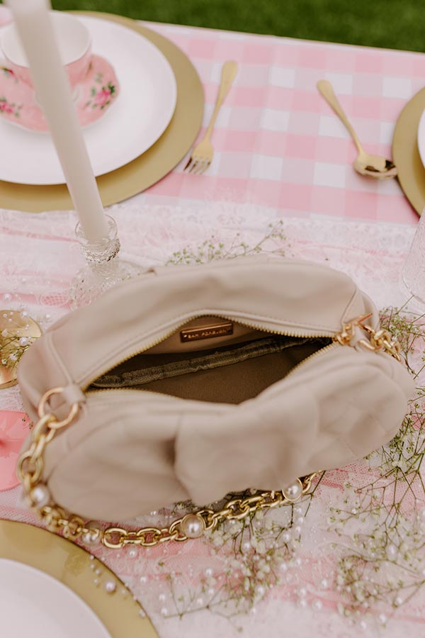 - A detachable chunky chain strap with faux pearl accents as well as a detachable faux leather shoulder strap with adjustable length