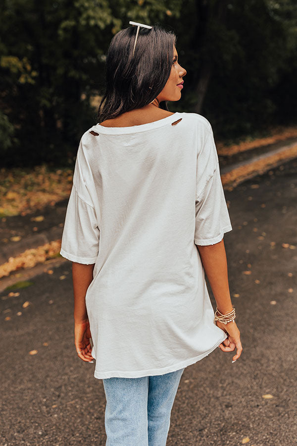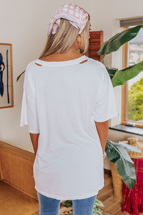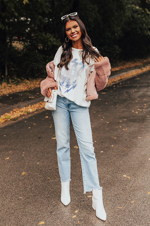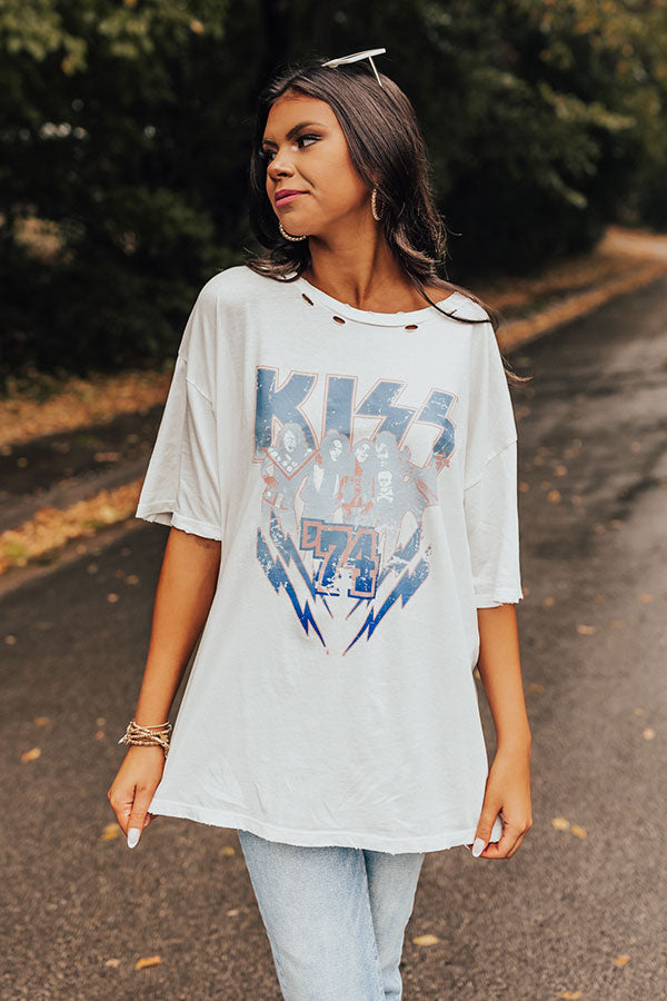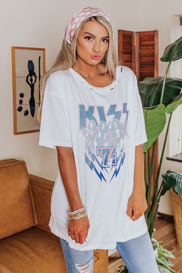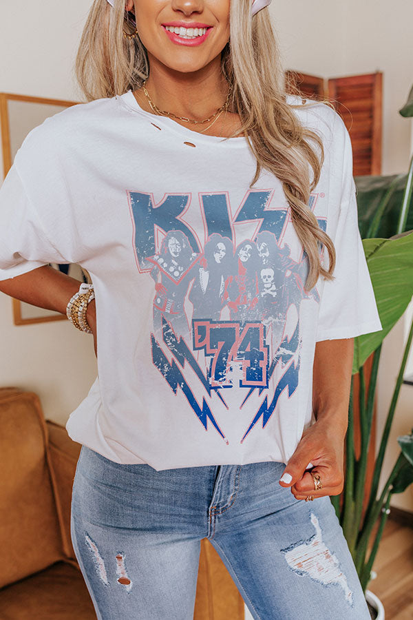 Rock and roll in our trendy white 'Kiss 74' tee featuring soft lightweight and flowy material with a cute blue hued band graphic on the front, a rounded neckline with subtle distressed detailing, short loose sleeves, and a slouched silhouette that ends in a straight hemline!