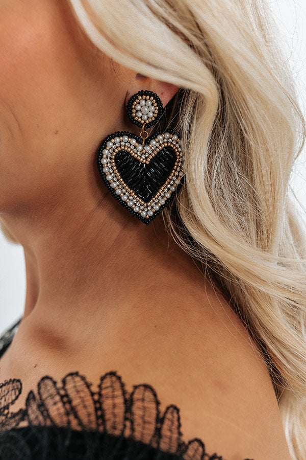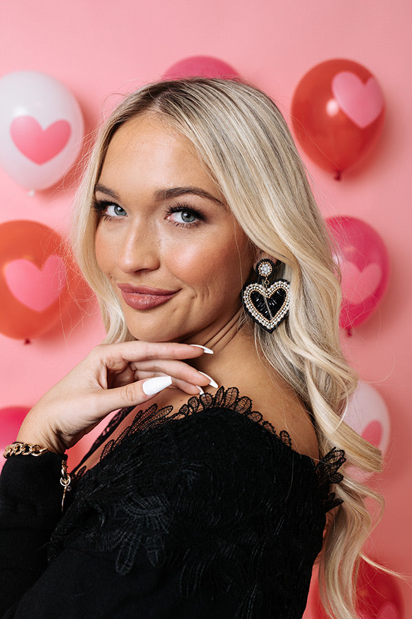 Make a bold statement this Valentine'd Day with our gorgeous black 'Kiss Me Daily' earrings featuring a beaded stud and large dangling heart!