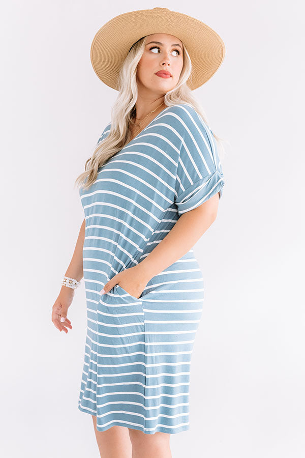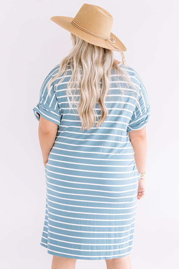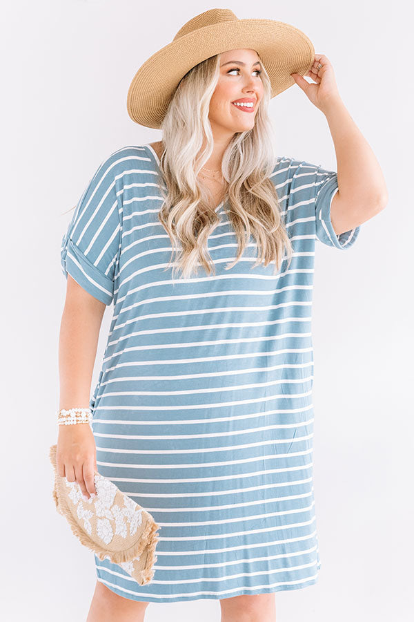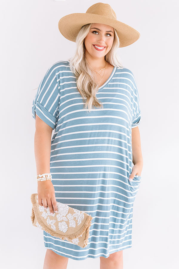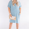 Plus Size - "Stripe" a pose in our casual airy blue "Kisses And Stripes Dress" featuring soft lightweight material patterned with horizontal white accents stripes, a wide v-cut neckline that can be worn off one shoulder, short loose sleeves with rolled cuffs, accent side pockets, and a relaxed silhouette that falls into a straight knee-length hemline! We have styled this closet essential with an embellished clutch and a brown mule heel and wool hat, but you can also wear it layered under a cropped white jean jacket and the "Flake Slip On Sneaker!" Measurements