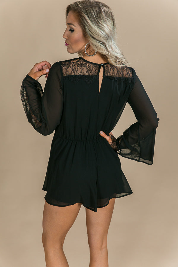 The little black romper game has reached an all time high in this babe! This laced sleeve romper wraps across the bodice with a front button closure that also buttons together behind the neck among the laced shoulders before cascading to flowing shorts. Steal a kiss in this romper of perfection!