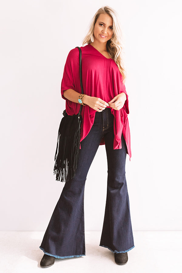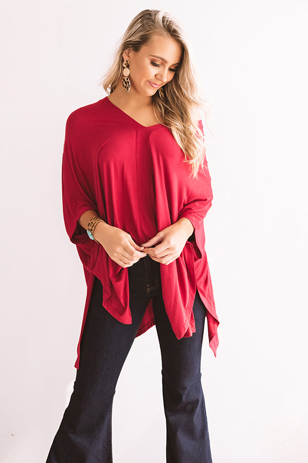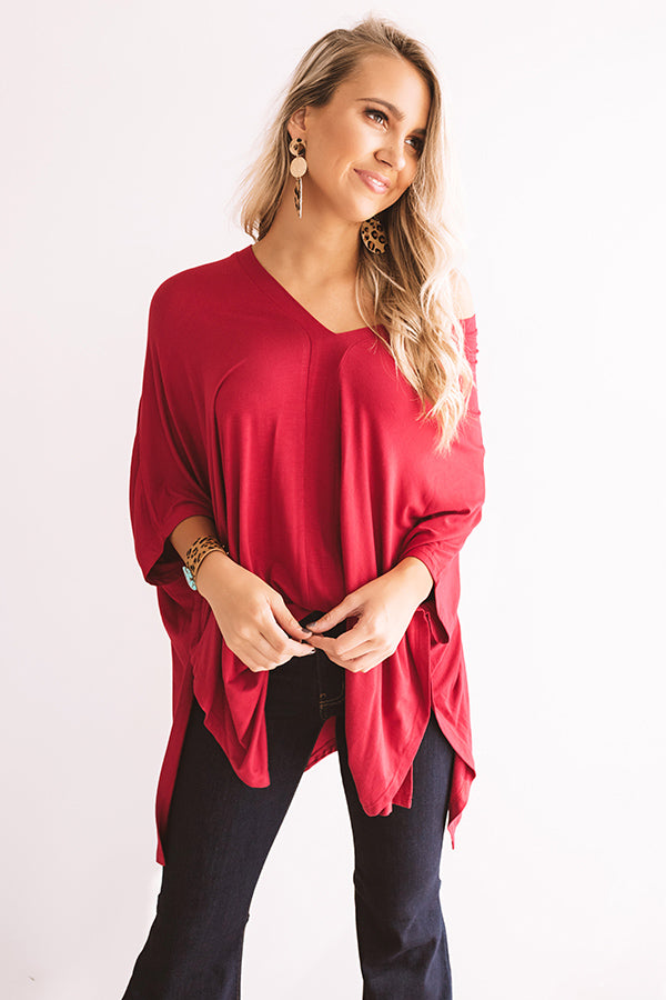 The crimson colored "Kisses By Midnight" shift tunic is the perfect lightweight top for any season with its draped stretchy lightweight material, v-cut neckline and upper back that can be worn off one shoulder, short bat wing sleeves, and an uneven upper thigh length hemline with side slits! This versatile transitional piece can be worn a variety of ways all year round, like with some dark wash flares and a black bootie and fringe crossbody, or you can style it for the warmer weather when you pair it with some frayed white shorts, "The Tipton Espadrille in Grey," and our "Bahama Breezy Earrings in Grey!" Measurements