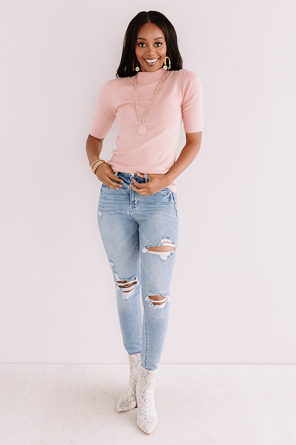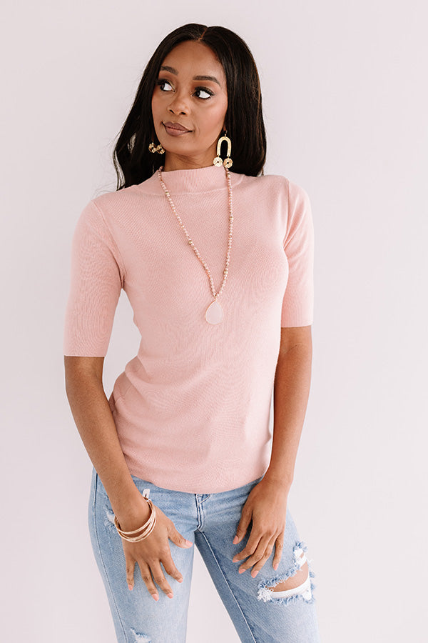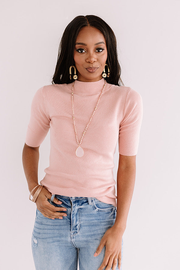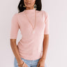 Who said switching seasons had to be hard on your style?! Effortlessly transition to fall in this adorable blush colored "Kisses By The Fire Top" featuring soft lightweight tight knit material, a high rounded neckline, form fitting half sleeves, and a figure flattering silhouette that falls into a straight hemline! We have styled this cutie with some distressed light wash skinnies and snake print booties, but you can also wear it layered under a grey cardigan with some frayed white shorts, "The Jess Faux Leather Heel in Grey," our "Pass The Prosecco Wool Hat in Blush," and "The Time Is Now Faux Leather Fringe Tote in Grey!" Measurements