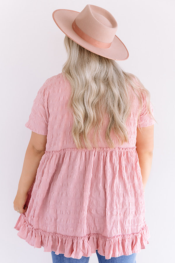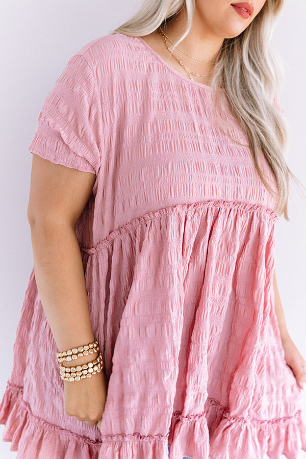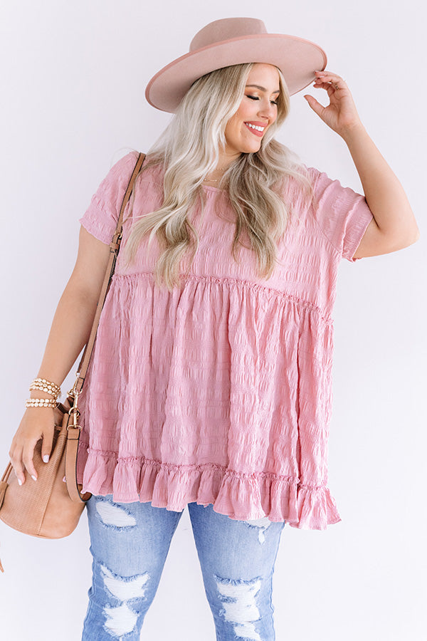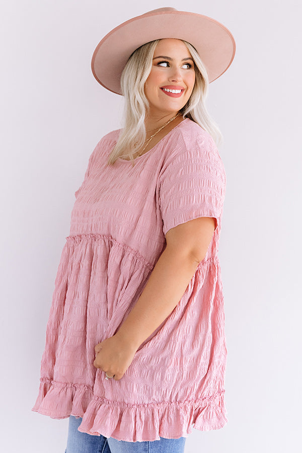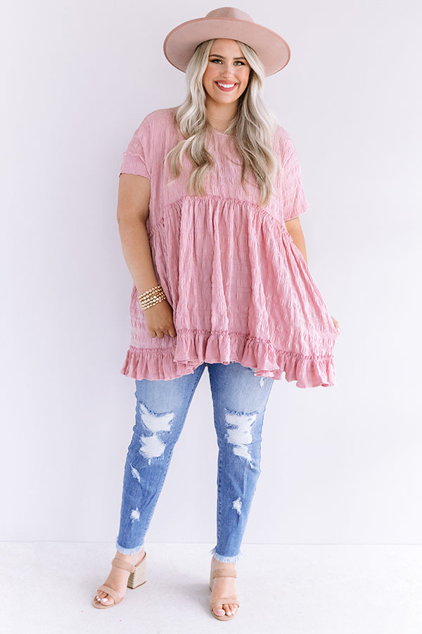 Plus Size - All eyes will be on you when you wear out flirty blush colored "Kisses In Capri" top featuring lightweight material with subtle crinkled texturing, a high rounded neckline, short loose sleeves, a fitted bodice with smocked detailing, and a relaxed babydoll silhouette that falls into an uneven ruffled tunic length hemline! You can style this casual cutie a variety of ways, like with some distressed ankle skinnies, a matching wool hat, and a neutral mule heel and faux leather bucket bag, but you can also wear it with some white shorts and "The Underwood Faux Leather Wedge in Blush!" Measurements