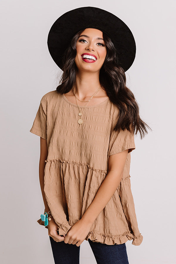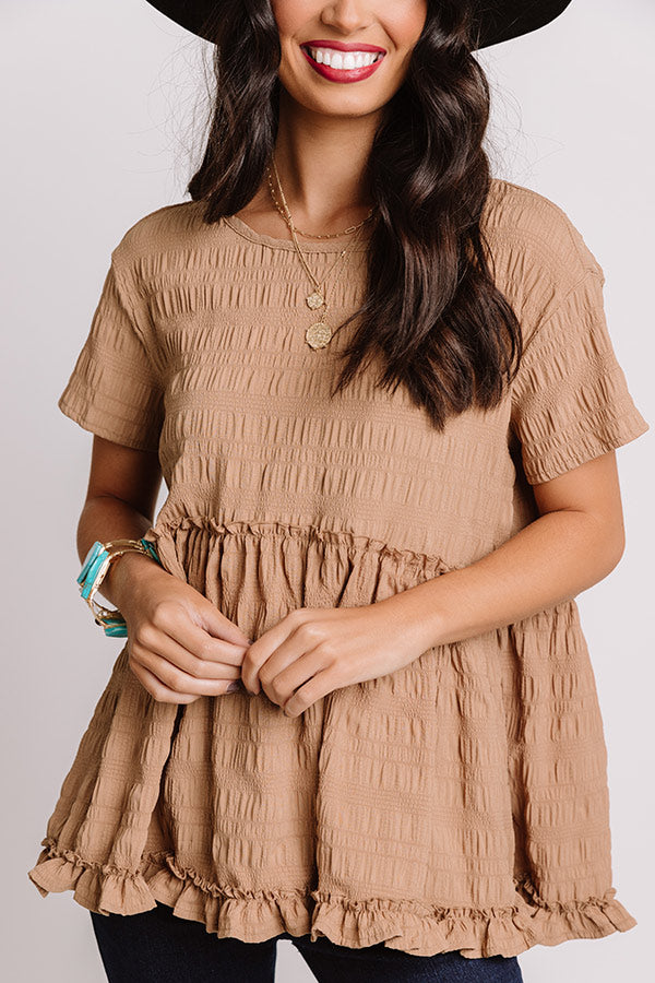 All eyes will be on you when you wear out flirty iced mocha colored "Kisses In Capri" top featuring lightweight material with subtle crinkled texturing, a high rounded neckline, short loose sleeves, a fitted bodice with smocked detailing, and a relaxed babydoll silhouette that falls into an uneven ruffled tunic length hemline! Measurements