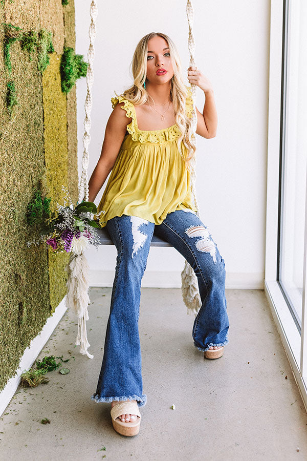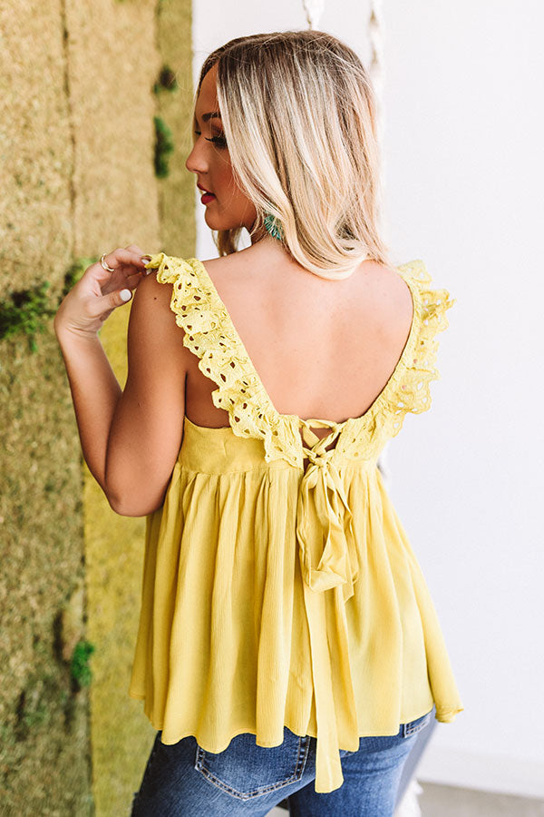 You are sure to be someone's summer crush when you wear this adorable yellow hued shift tank featuring lightweight breezy material, intricate crochet trim detailing across the square neckline and on the spaghetti shoulder straps, a deep v-cut back with a lace up closure, and an ultra relaxed silhouette that falls into an uneven hemline! We have styled this cutie with some distressed flares, turquoise statement jewelry, and woven platform heels, but you can also wear it with some frayed white shorts, "The Faye Wedge in Cinnamon," our "Friday Nights Faux Leather Crossbody in Cinnamon," and our "Ray Of Light Tortoiseshell Sunnies!" Measurements