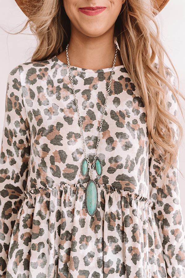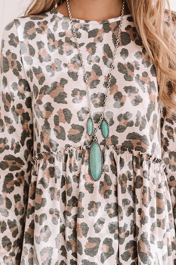 You will be known for being fabulous when you accessorize with this statement necklace featuring a long silver chain and three large oval turquoise faux stone pendants!