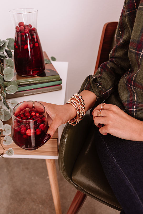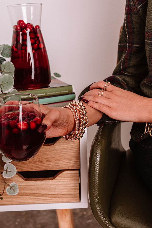 You are sure ton influence the style of those around you when you accessorize with this stunning bracelet set featuring five various sized bright gold beaded stretch pieces!