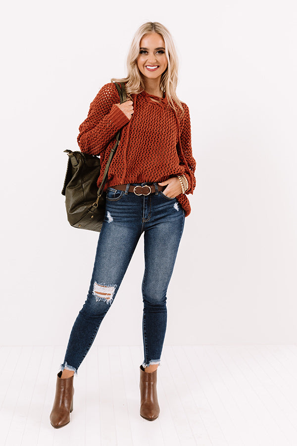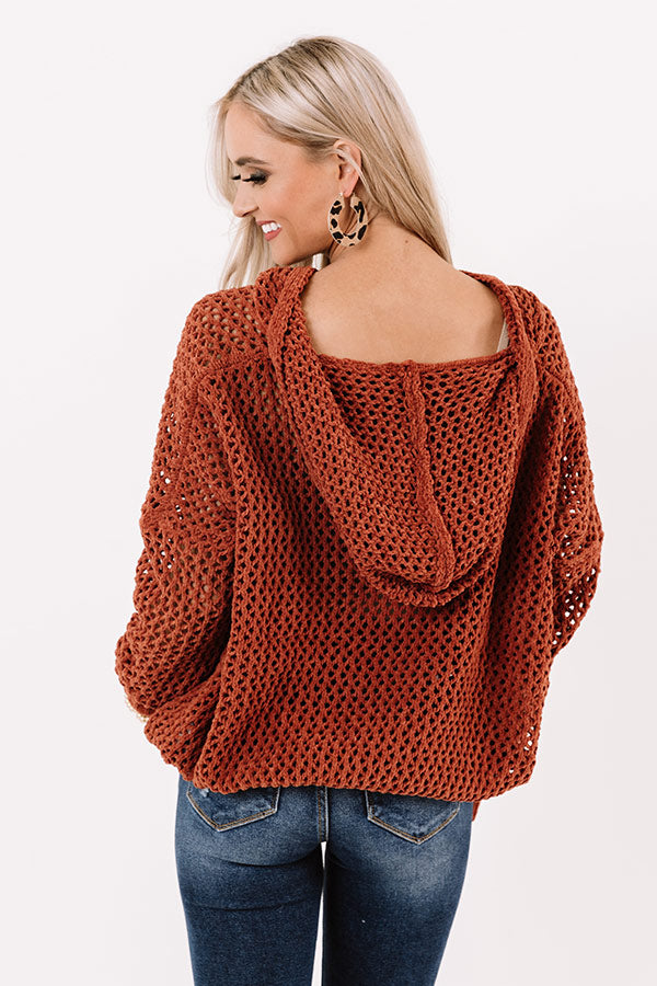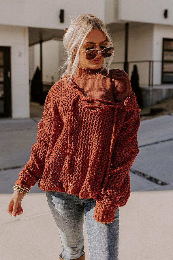 You are sure to look the part of an influencer when you wear this trendy rust colored hoodie featuring ultra lightweight semi-sheer loose knit material, a lace-up neckline with a drawstring hooded back, long loos sleeves with fitted cuffs, and a slouched silhouette that ends in a straight hemline!