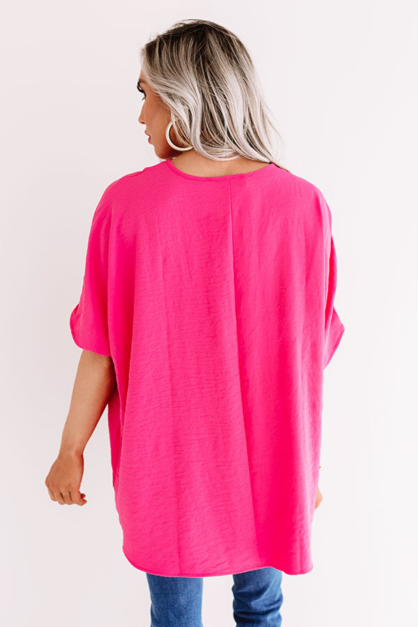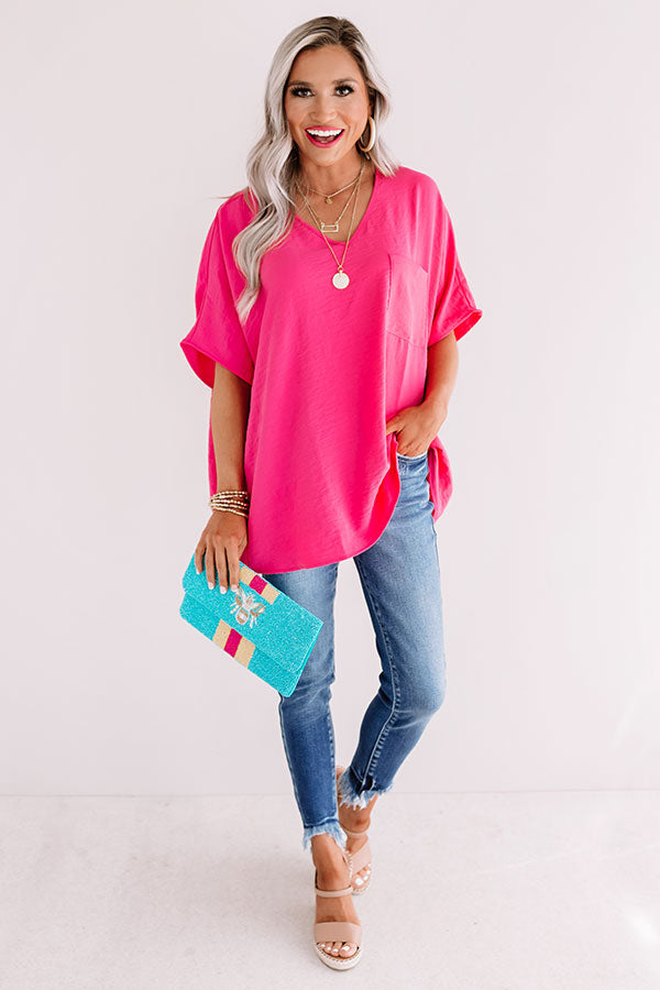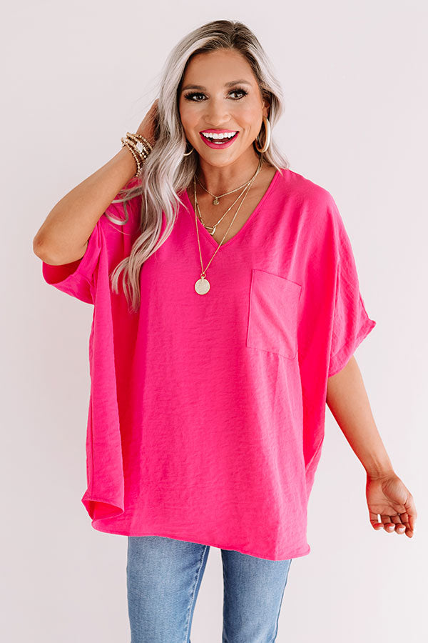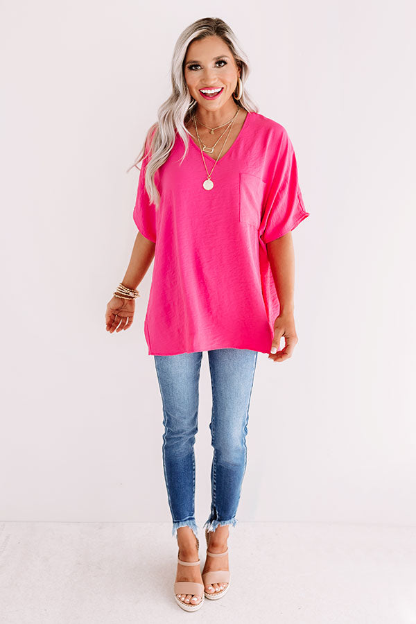 You are sure to look like you live an an upscale "L.A. lifestyle" with this casual hot pink shift top featuring ultra lightweight sleek material, a v-cut neckline, short loose sleeves, an accent chest pockets, and a relaxed silhouette that falls into a rounded hemline! You can style this upscale basic with some distressed ankle skinnies, a neutral heel, and a beaded clutch, but you can also wear it layered under a cropped jean jacket with some frayed white shorts, "The Ariella Heel in Hot Pink," and our "Quay Rumours Sunnies in Black!" Measurements