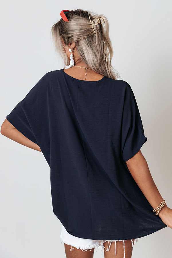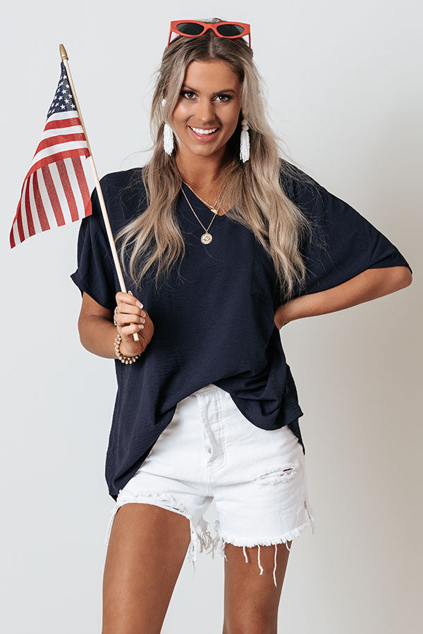 You are sure to look like you live an an upscale L.A. lifestyle with this casual navy shift top featuring ultra lightweight sleek material, a v-cut neckline, short loose sleeves, an accent chest pockets, and a relaxed silhouette that falls into a rounded hemline! Measurements