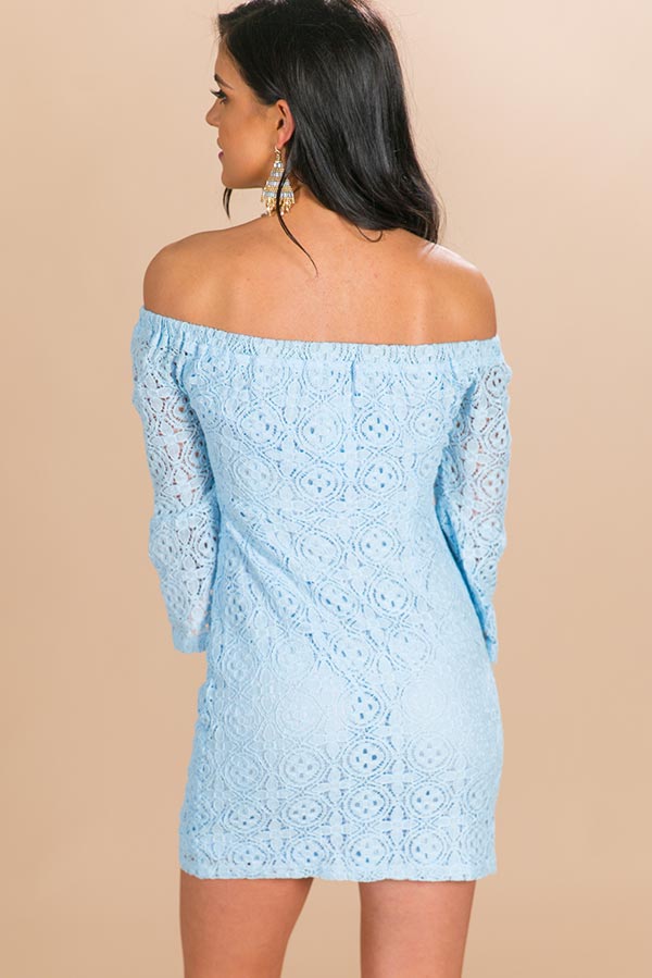 Lace At First Sight Off Shoulder Dress in Sky Blue