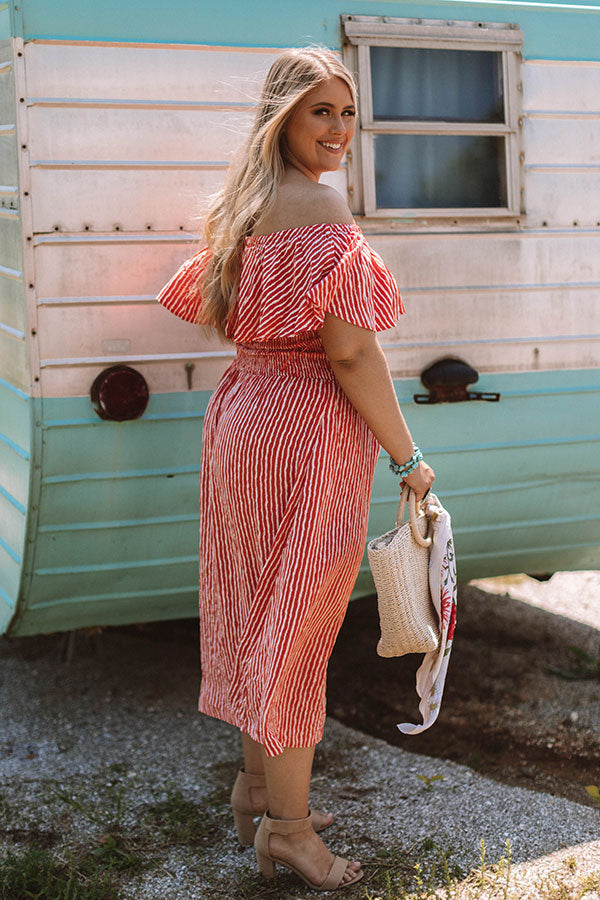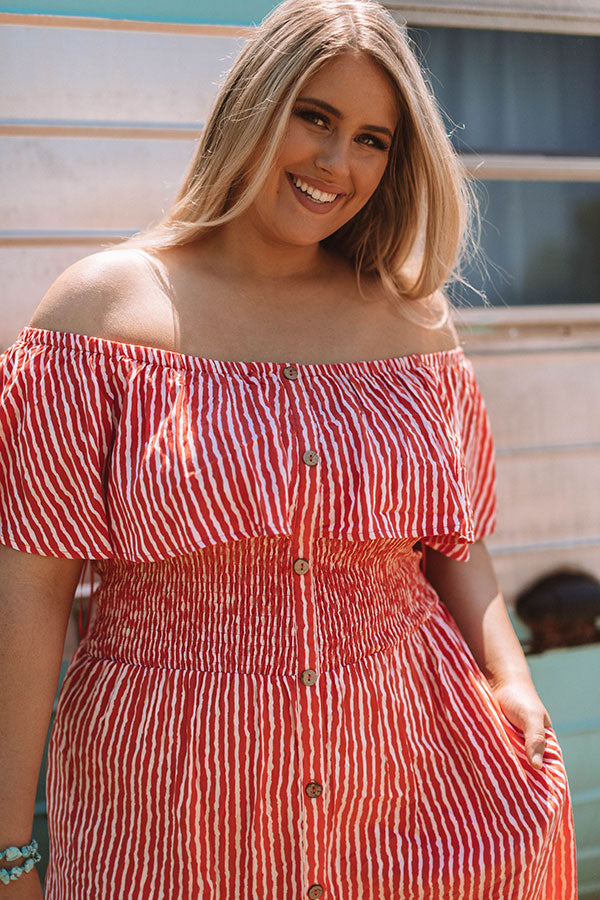 Plus Size - One year equals 365 chances to wear amazing outfits and we think this luxurious orange midi should be one of those! This off-the-shoulder piece features a button up front and a smocked bodice under a fabric overlay! Style this striped dress with some nude, strappy heels and diamond jewelry for a posh summer look! Measurements