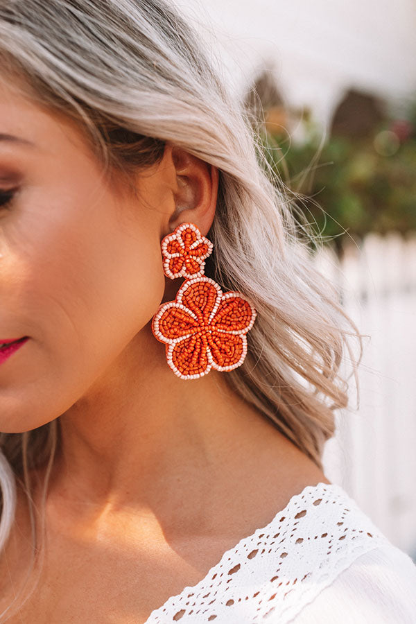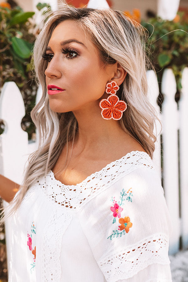 Your OOTD will be blossoming when you accessorize with our adorable "Lagoon Luxe" statement earrings featuring orange hued beaded flower studs and larger dangling flowers!