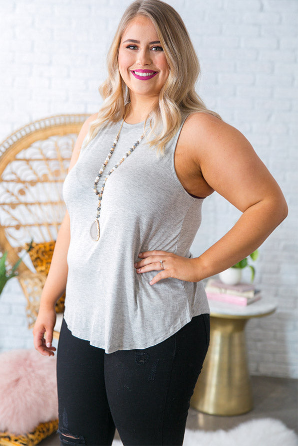 You'll find yourself living in this versatile grey basic! This sleeveless jersey knit tank has a round neckline and a relaxed shift silhouette that's easy to layer under any look! Measurements