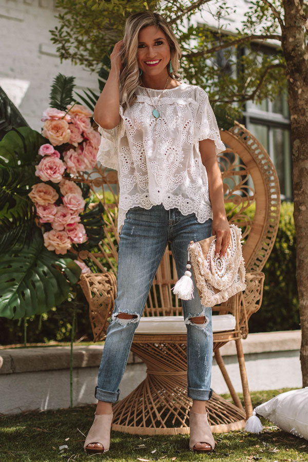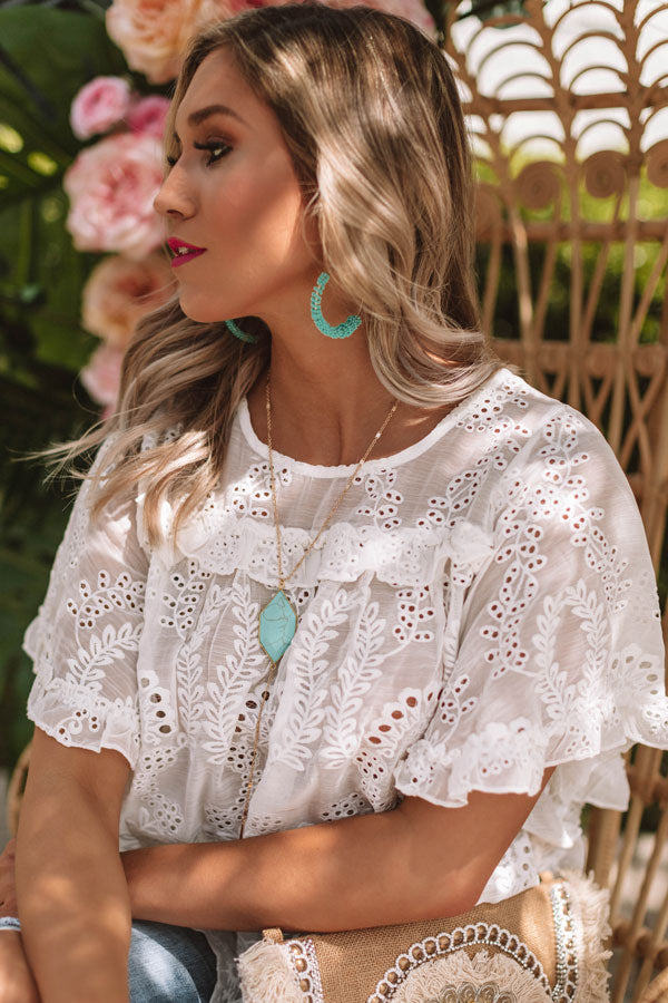 You will slip into a "Laguna beach" vacay mode when you slip into this white top featuring intricate eyelet detailing, ruffle trim, and a thick uneven lace hem! This beautiful top can be paired with distressed cuffed jeans, neutral wedges, and a boho clutch or you can style this neutral top with a pop of pink in our "Latte Run Midrise Distressed Shorts in Light Pink" and "Cocktail Party Earrings in Light Pink" for a fashionable and feminine summer holiday look! Measurements