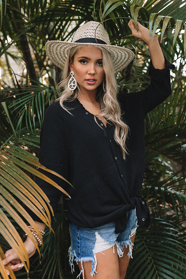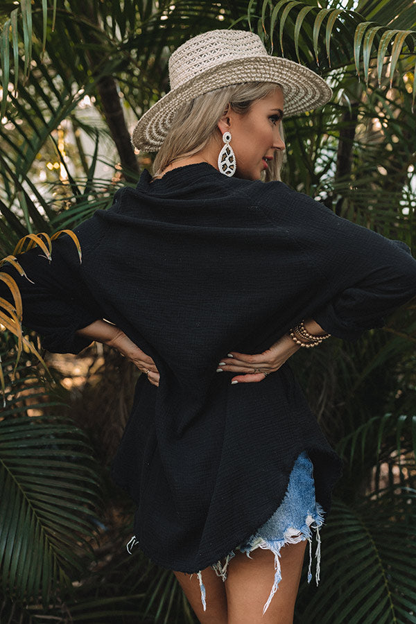 Hit the highway in this timeless black top featuring lightweight and breezy linen-like material, a button down front with a subtle collared neckline, long loose sleeves with cuffs that can be rolled, accent front pockets, and an ultra slouched silhouette that ends in a rounded tunic-length hemline with fringe edge detailing! Measurements