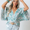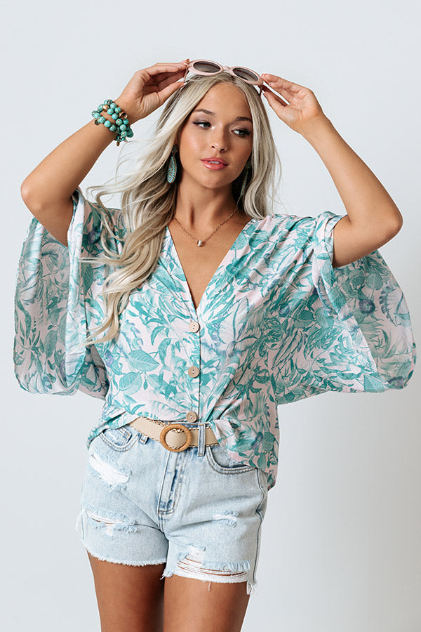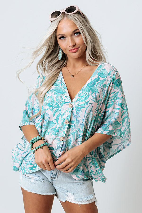 Create your own sunshine in this lively shift top featuring lightweight breezy material patterned with a teal hued leaf print, a button down front with a v-cut neckline, oversized bat wing half sleeves, and a relaxed silhouette that falls into a rounded hemline! Measurements