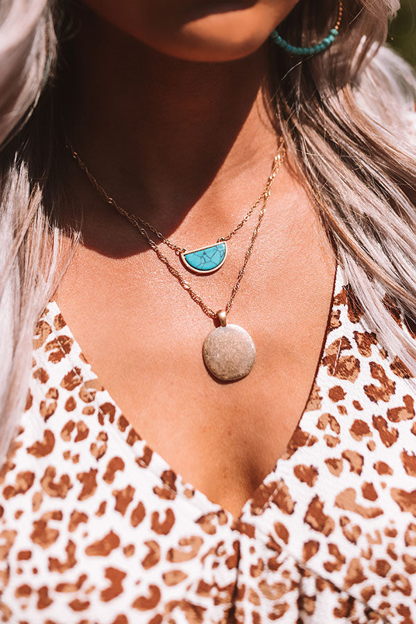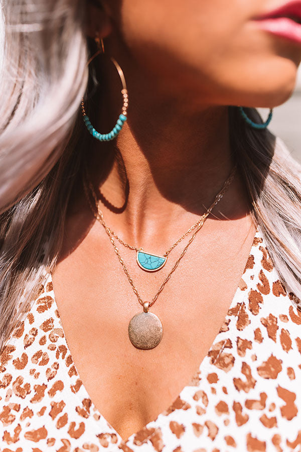 Get ready to have a good day by accessorizing with our adorable "Laguna Surf Necklace" featuring two layered gold link chains with a turquoise half circle and a larger full circle charm!