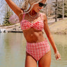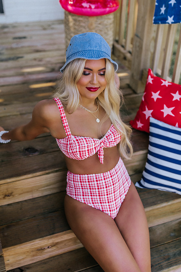 Enjoy those upcoming lake days in style with this fashionable bikini top featuring lightweight four-way stretch material with a red and white seersucker pattern, a sweetheart neckline with adjustable 1-inch shoulders straps, and a flattering front tie silhouette with a hook closure in the back! Plus, this bikini top comes with removable padding.