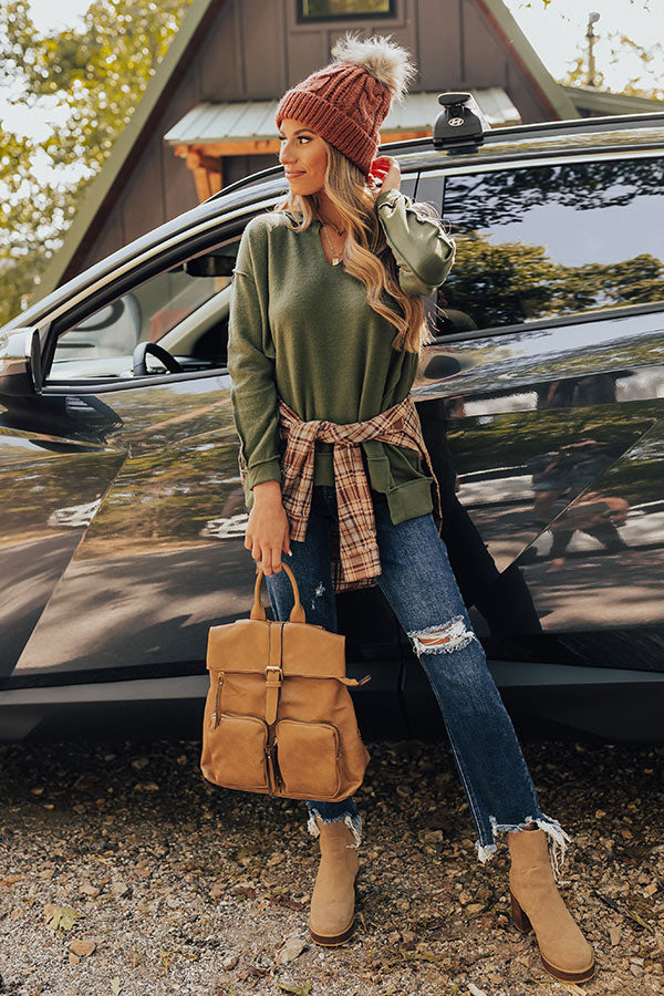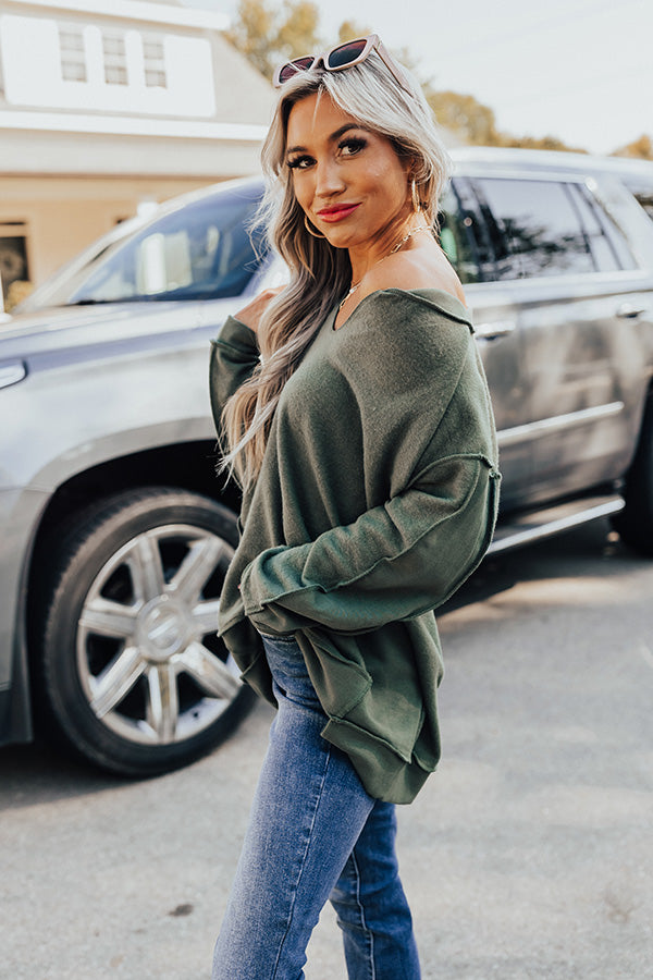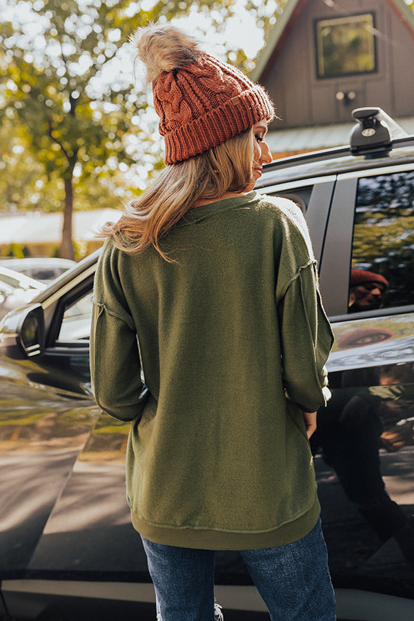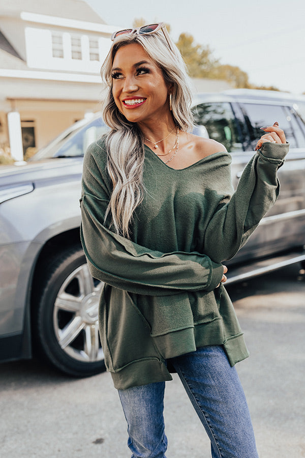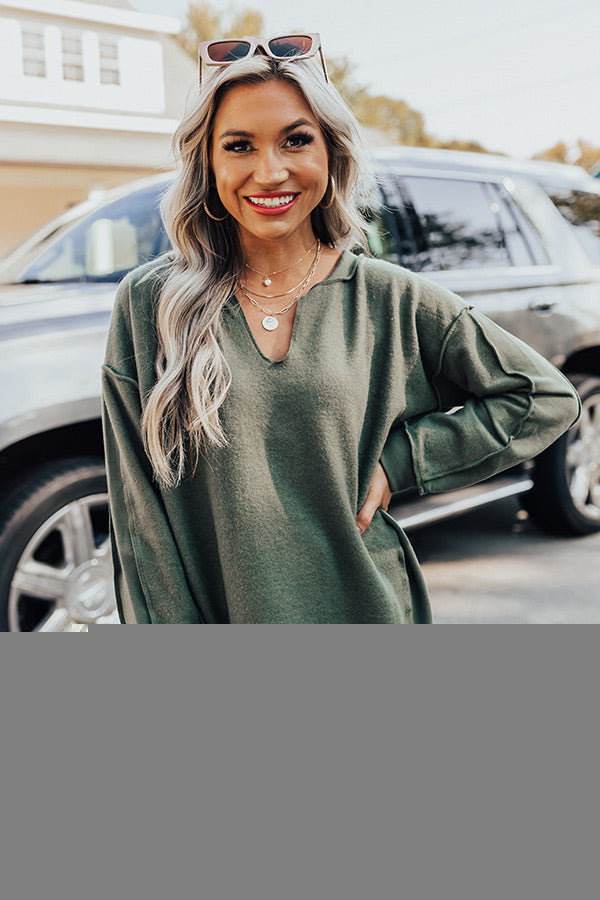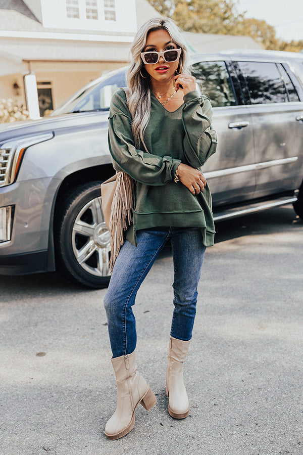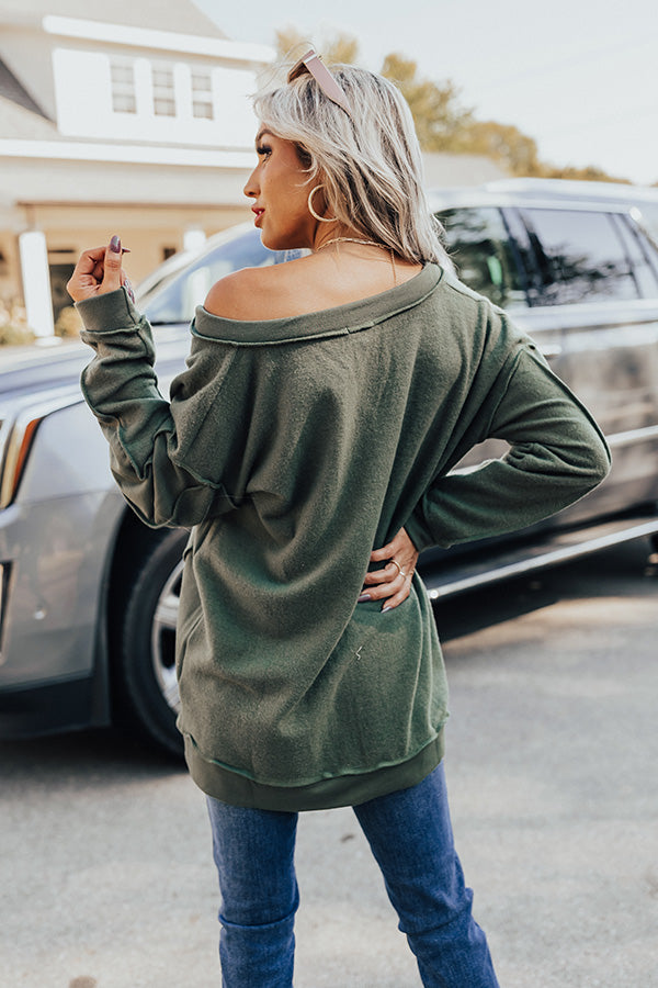 Go home for the harvest in the 'Lake Tahoe Or Bust' sweatshirt! Features ultra soft olive colored material, v-neckline, long relaxed sleeves with cuffs, exposed seams, and relaxed fit that falls into uneven hemlines.