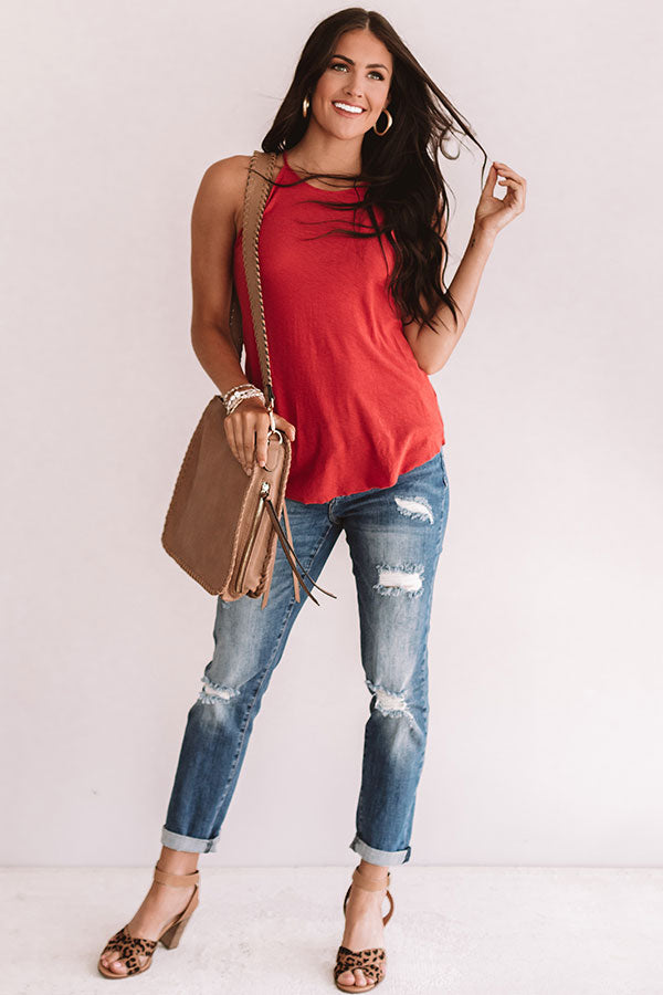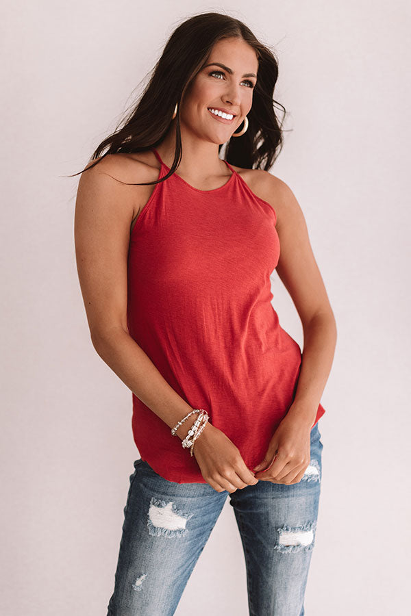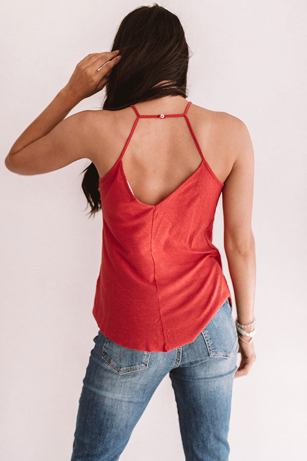We hope docs and flip flops are in your future this summer and we think you should wear this aurora red shift tank to your "lake weekend" with its high neckline, rounded hem, spaghetti straps, and open back with an accent shoulder strap! You can style this piece with distressed ankle jeans, leopard heels, and a neutral crossbody or with our "Pixie High Waist Destroyed Shorts," sunnies, and the "St. Martin Sandal" for a water front hangout look! Measurements