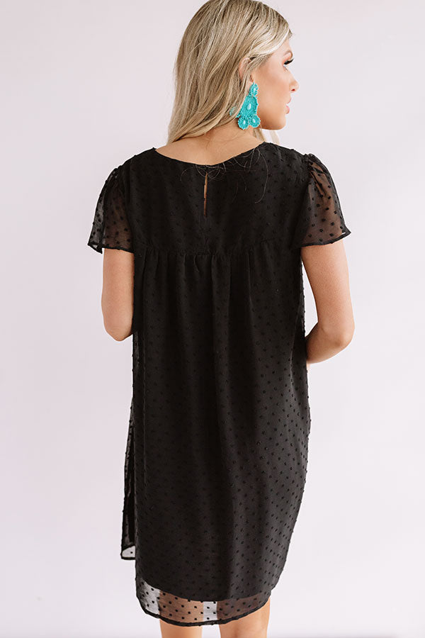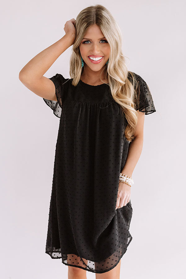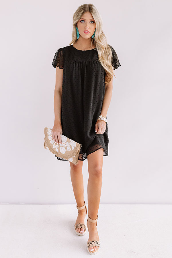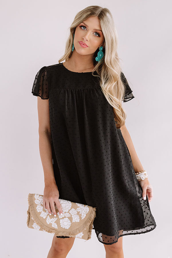 Get off the plane looking stylish after "landing in Laguna" with this adorable little black dress featuring lightweight semi-sheer layered material patterned with subtle polka dot texturing, a high rounded neckline, short flounced sleeves, a keyhole accented upper back with a cutout closure, and an ultra relaxed babydoll silhouette that falls into a straight mid-thigh length hemline! We have styled this cutie with some turquoise statement earrings, leopard wedges, and an embellished clutch, but you can also add a pop of color by wearing it with "The Ariella Heel in Hot Pink" and our hot pink "Jetsetter Chic Hair Scarf!"