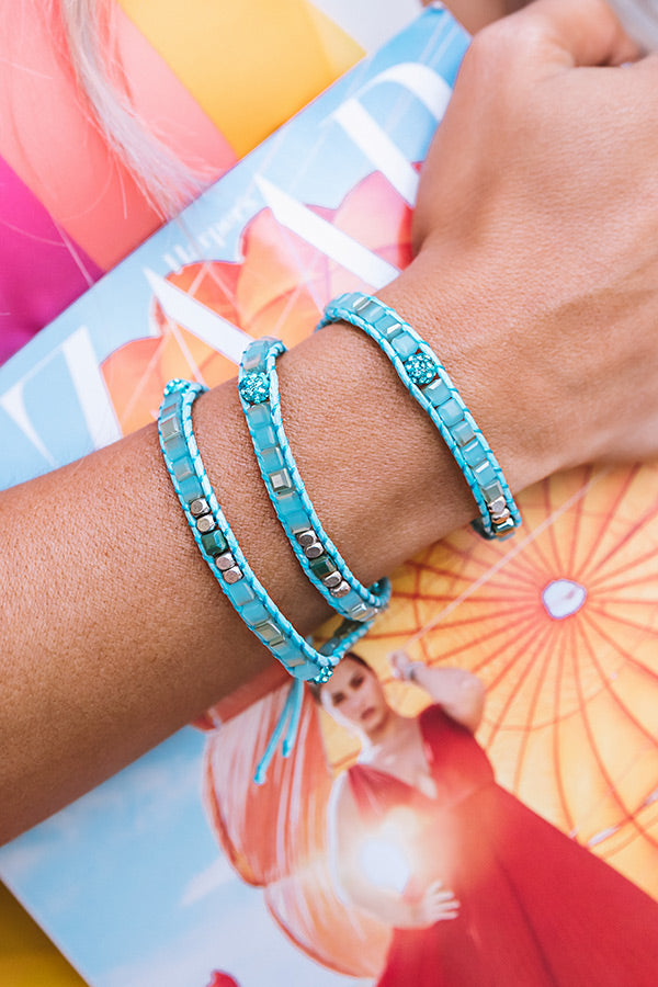 Add a touch of boho to your OOTD with our adorable light turquoise "Lane To Paradise" wrap bracelet featuring woven square beads!
