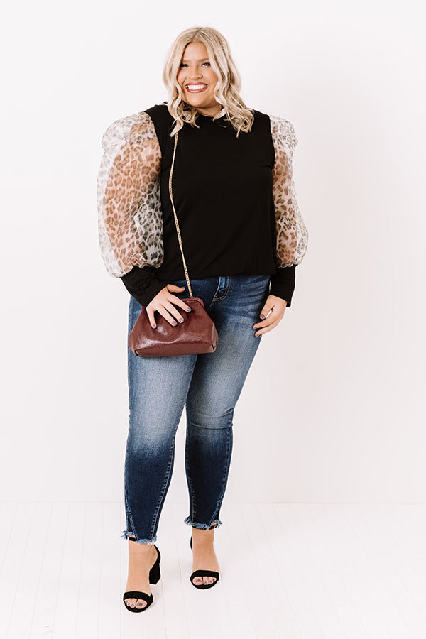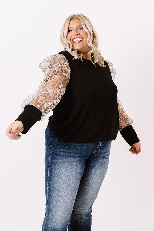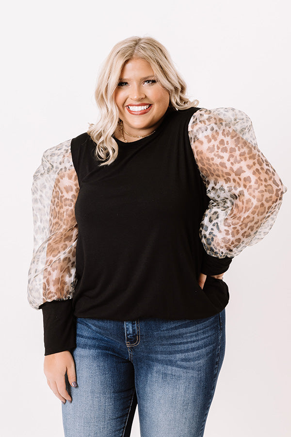 Plus Size - Spend your last night in London in style with this luxurious black top featuring a lightweight bodice with a high rounded neckline, long semi-sheer sleeves patterned with a bold leopard print, puff sleeves, and fitted forearm cuffs, and a flattering silhouette that ends in a straight hemline! Measurements