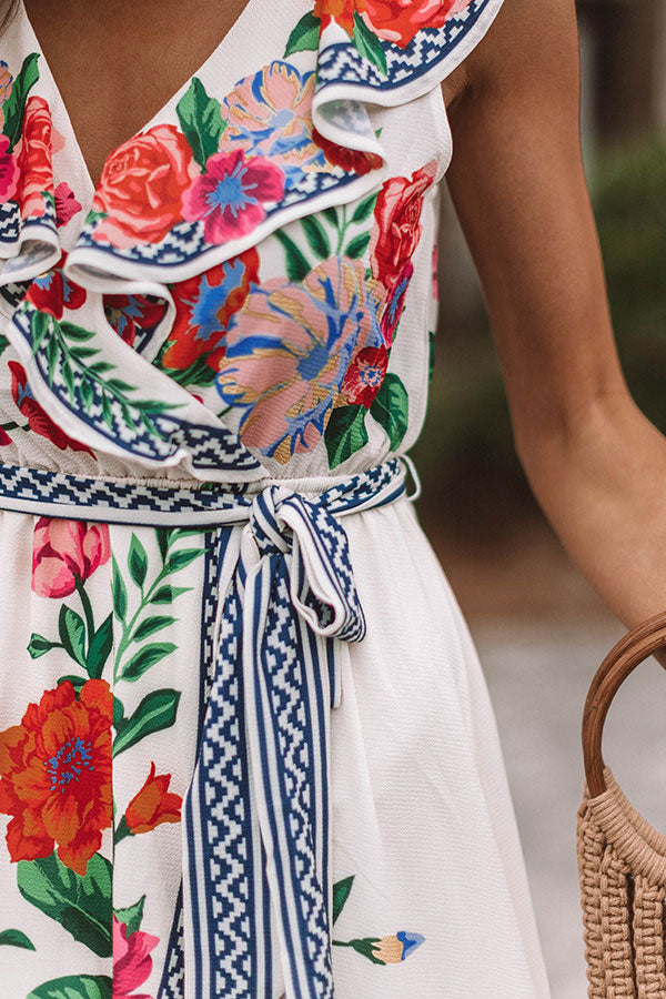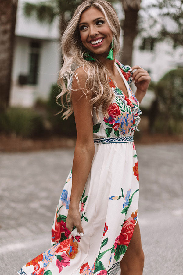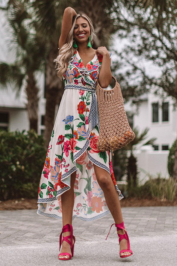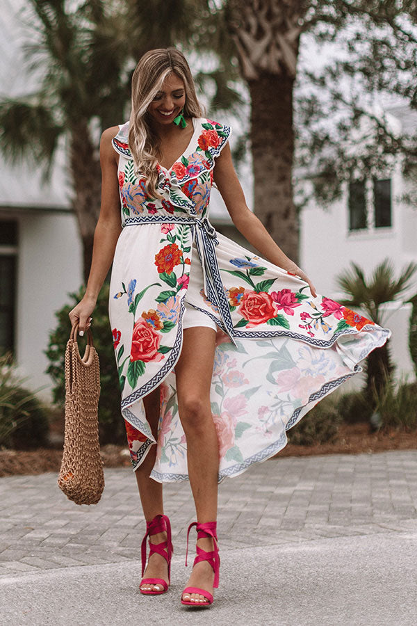 This pretty print midi dress has short ruffled cap sleeves and a v-cut neckline with ruffle detailed lining that follows the neckline & back. With hidden inside button closure & an elastic waist band that leads into a wrap high-low hemline skirt.