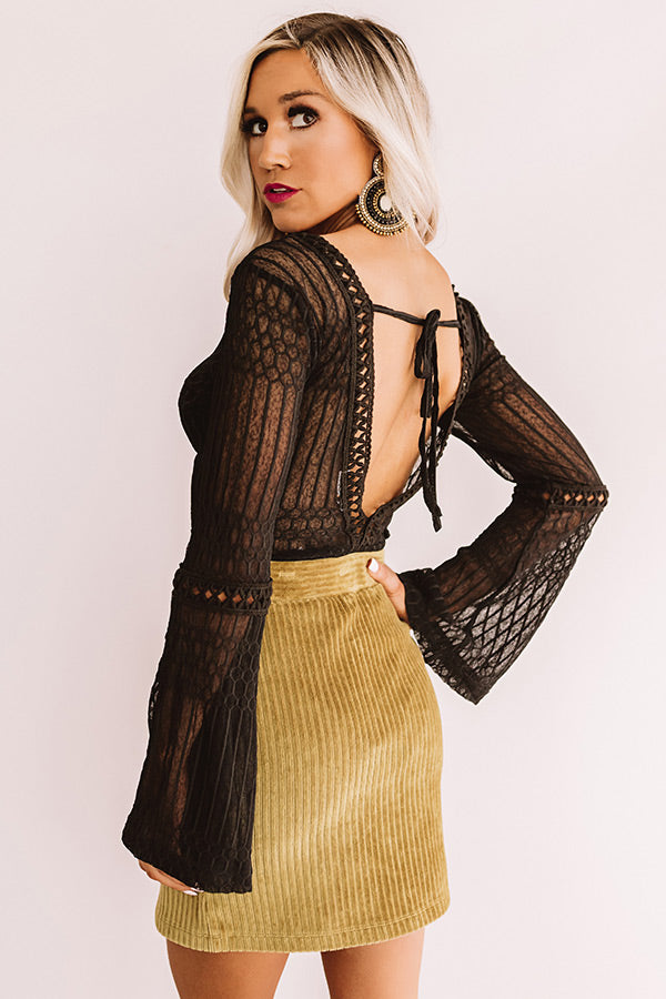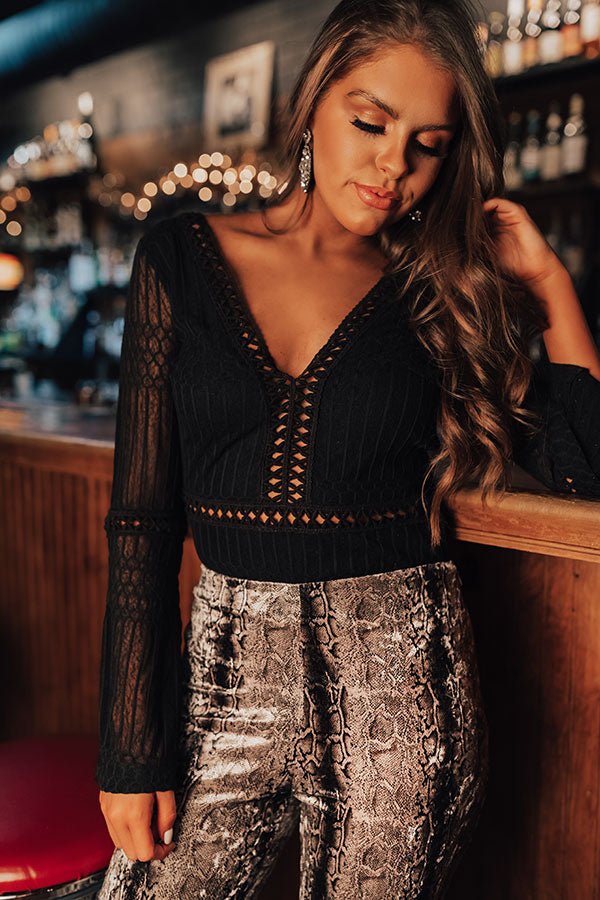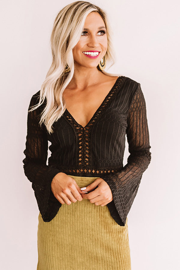 Don't be the last person to love this black bodysuit and miss out on how stunning you will look in it! It features stretchy material, a v-cut neckline, long semi sheer loose sleeves with flared cuffs, lace detailing throughout, an open back with a tie closure, and a cheeky fit with a two snap closure! You can style this piece under any type of bottoms and wear any type of outerwear with it for a variety of looks that will carry you from season to season! Measurements