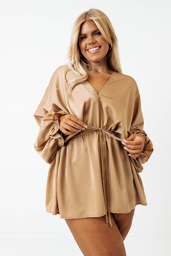 The perfect piece to take your from nine to wine, our pretty iced latte colored plus size 'Late Night Talks Top' features sleek lightweight material, a v-cut neckline, long bishop sleeves with flared cuffs, a cinched waistline with a tie closure, and a flattering silhouette that falls into a straight peplum silhouette!