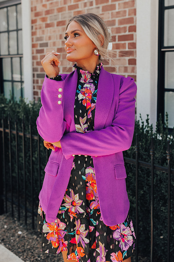 Bring the WOW back into your work wardrobe with the "Latest Obsession Blazer!" This chic cropped open front blazer features beautiful orchid colored material, single button closure, flap pockets, fitted long sleeves with lightly padded shoulders & a rounded bottom hem.- Gold buttons accent the sleeves & the front bodice of the blazer.- Fully lined.- Hand wash cold. Hang to dry.